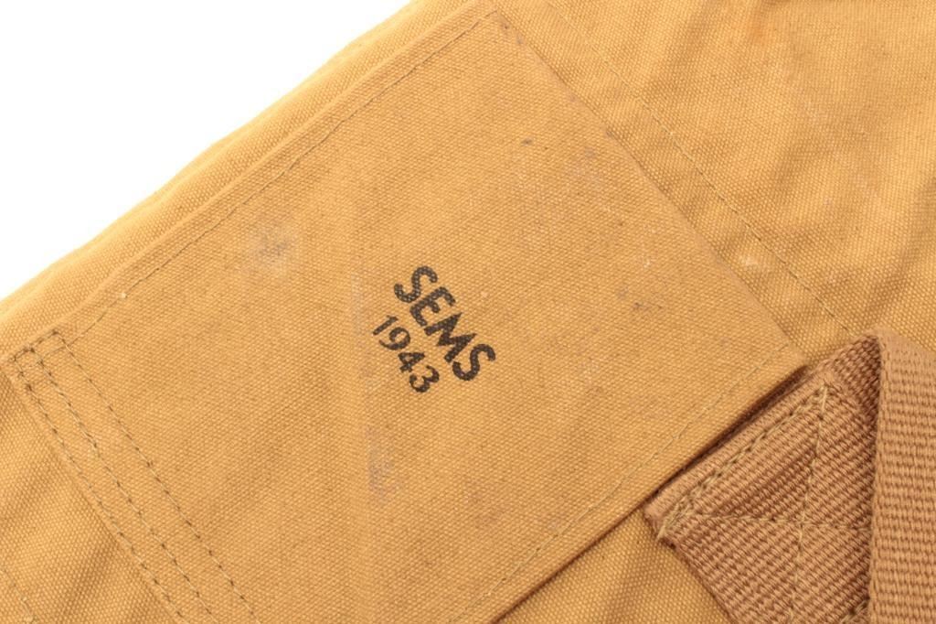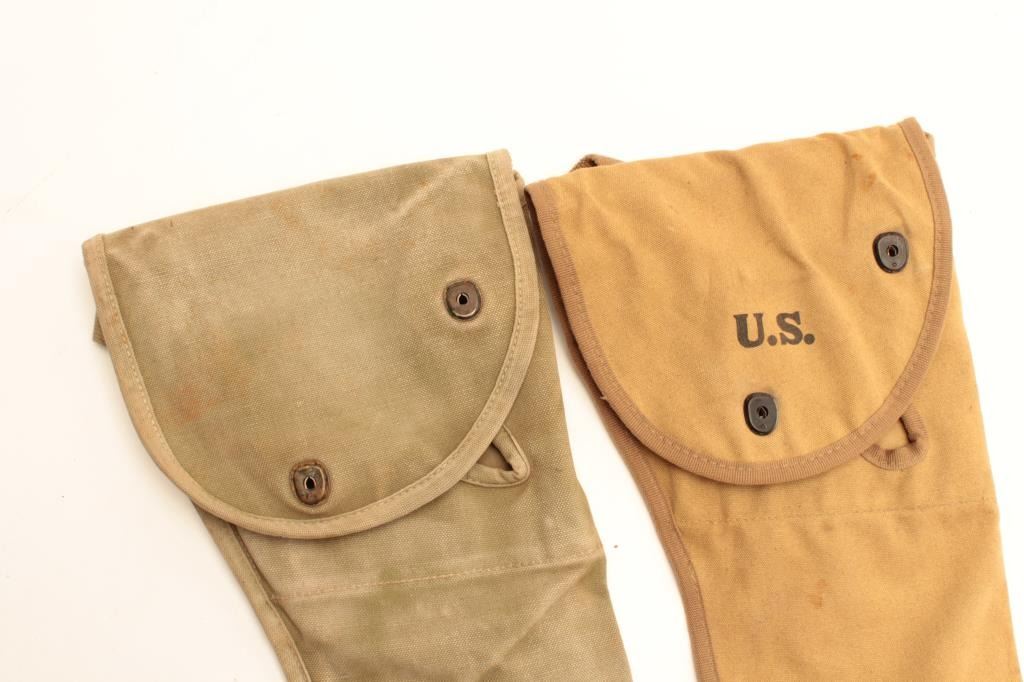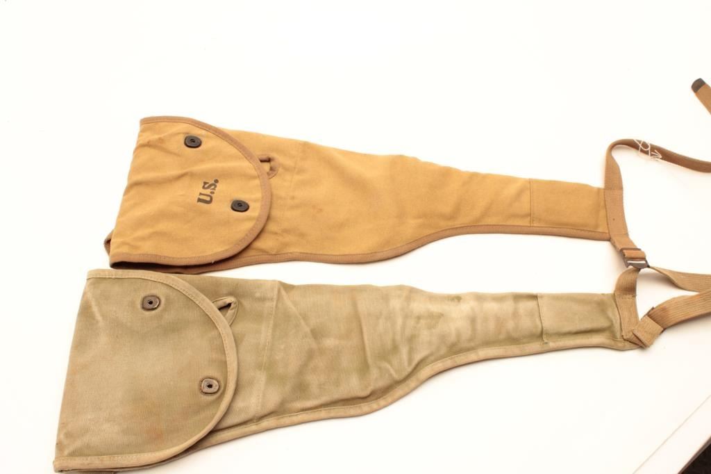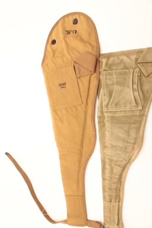 Two G.I.-issue canvas “jump” cases for M1 Paratrooper carbines; one Sems 1943 and U.S. marked in tropical brown color; one unmarked drab green; Sems is very good and unmarked is good. Est.: $100-$200.