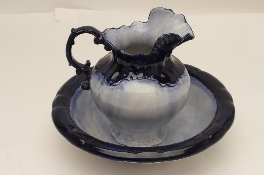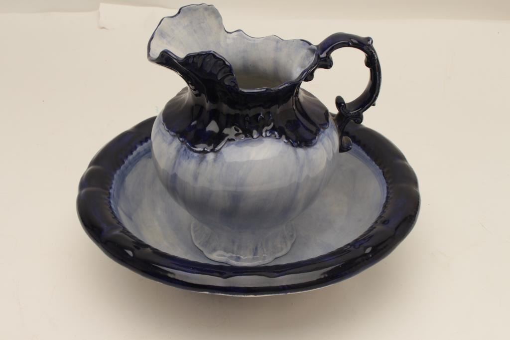 Wash bowl and pitcher marked “Norway”; ca. turn-of-the-century; blue and white porcelain. Est.: $100-$200.