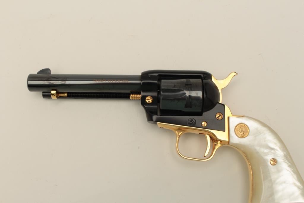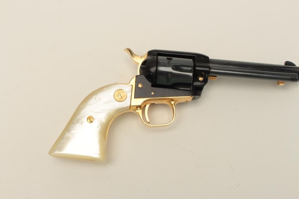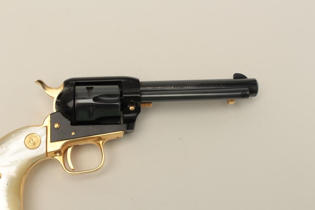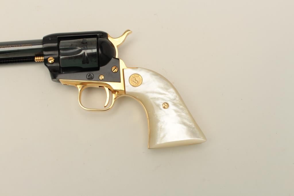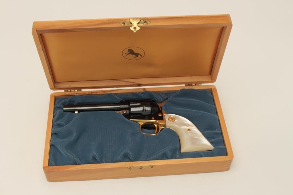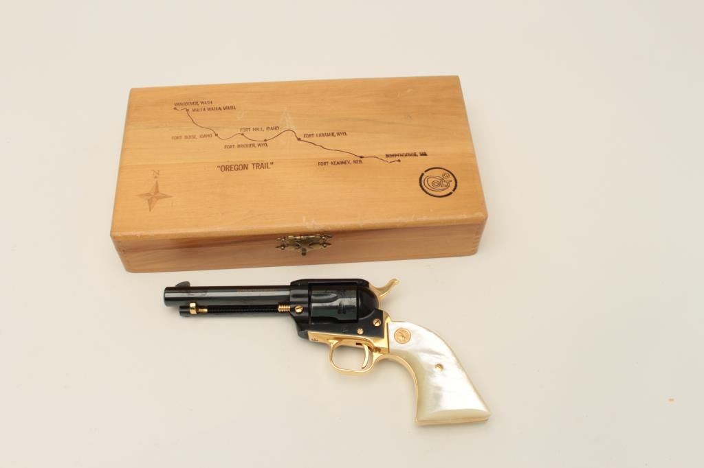 Colt Oregon Trail Commemorative Model Frontier Scout single action revolver, .22 caliber, 4.75” barrel, blued and gold accented finish, faux pearl medallion grips, in factory wood presentation case, S/N1621OT, in overall like new condition showing little handling to gun; some storage mars to top of casing. (Modern/PPT). Est.: $250-$500.