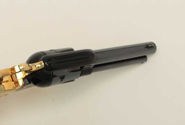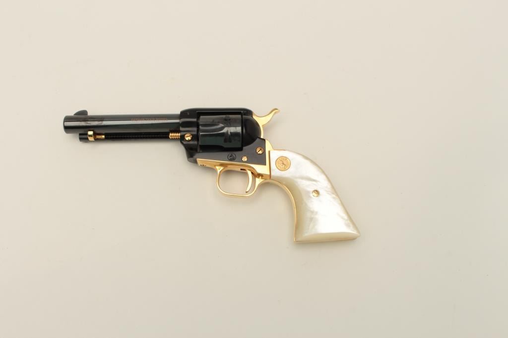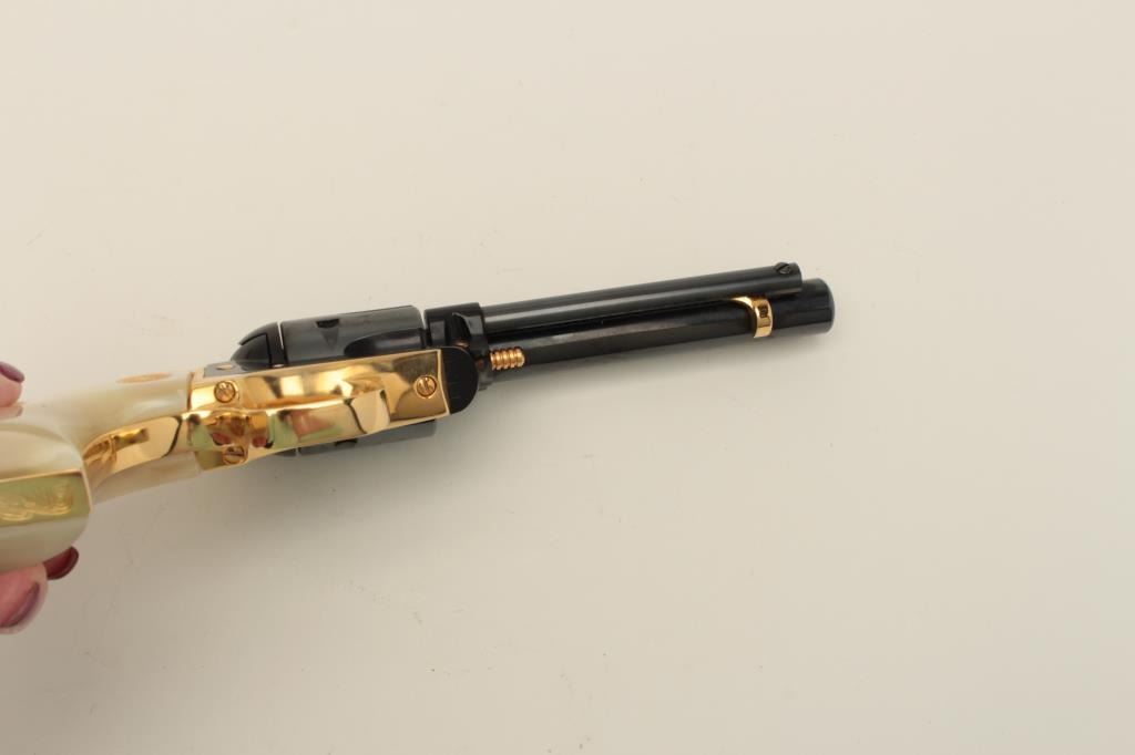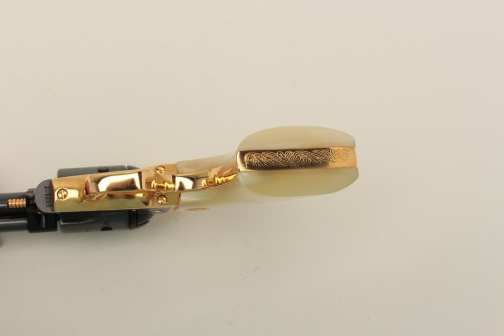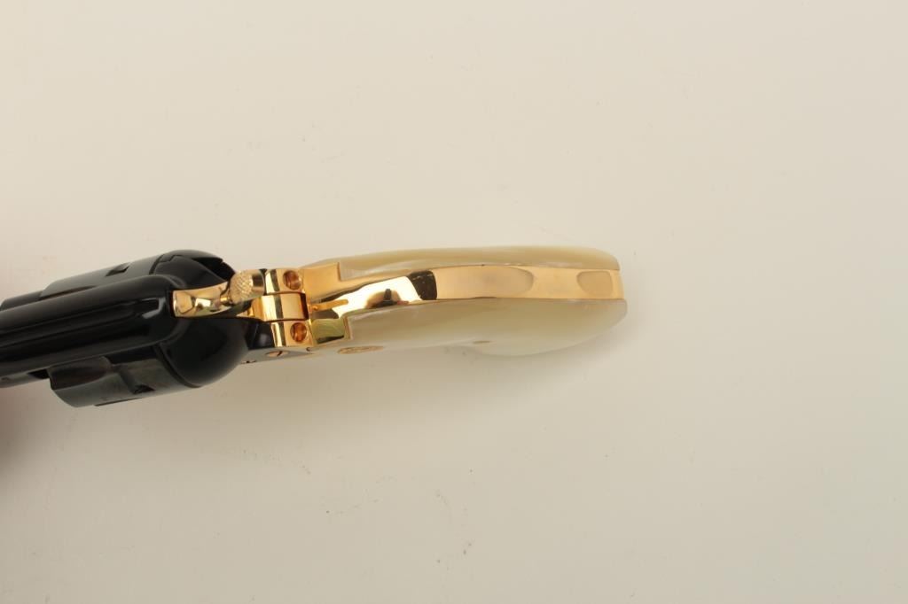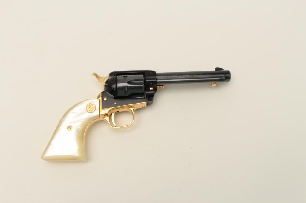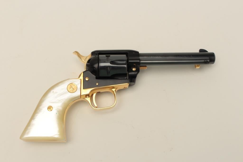 Colt Oregon Trail Commemorative Model Frontier Scout single action revolver, .22 caliber, 4.75” barrel, blued and gold accented finish, faux pearl medallion grips, in factory wood presentation case, S/N1621OT, in overall like new condition showing little handling to gun; some storage mars to top of casing. (Modern/PPT). Est.: $250-$500.