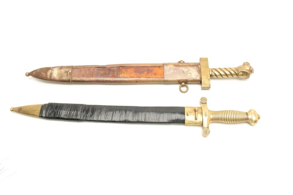 Lot of 2 movie prop swords. One is a brass handled short sword with sheath wrapped in black tape and is numbered 4914 measuring approximately 26”. The other is a brass handled short sword with sheath showing rams head on the handle and measures approximately 25 1/4”. Est.: $150-$300