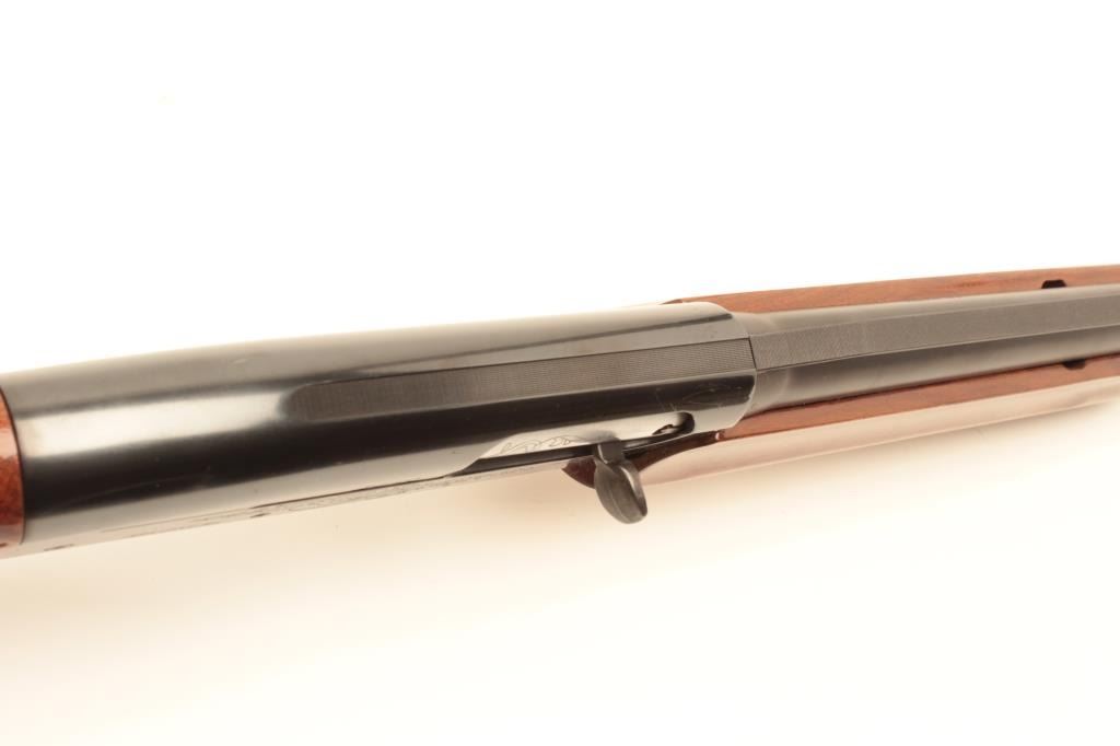 Remington Model 1100 (Magnum-marked) semi-automatic shotgun, 12 gauge with choke, 26” ventilated rib custom barrel made by Art Vierkler of Graham, WA and marked “Roy Hockett” on the left side of the barrel nearthe breech; checkered wood stocks, S/N L904975M, in overall very good to fine condition; crisp action, sharp markings, bore is very good to fine, wood is also very good to fine with Remington hard rubber butt pad. Accompanied by 4 additional 12 gauge barrels in factory boxes; all showing majority of finish and with good bores. (Modern/No PPT). Est.: $300-$600.