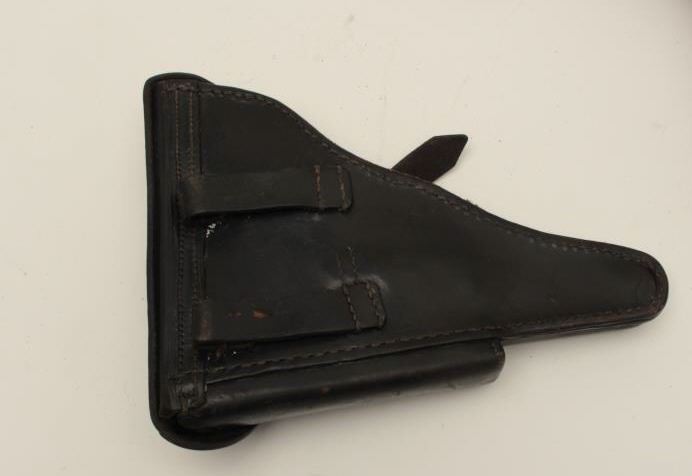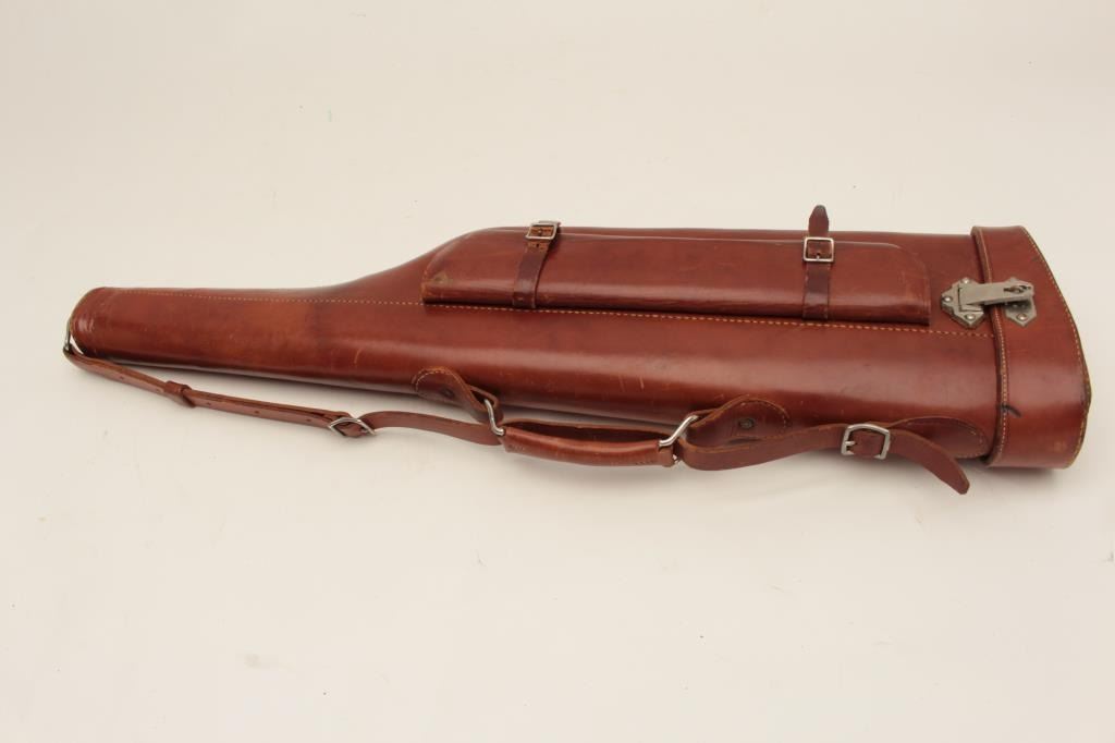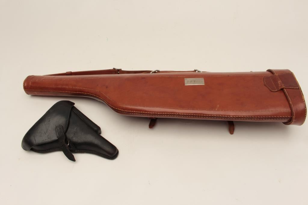 Leather lot including a brown leather mutton leg style shotgun carry case with plaque marked “R.M. Kaiser” and a German Luger flap military holster with takedown tool. Est.: $150-$300.