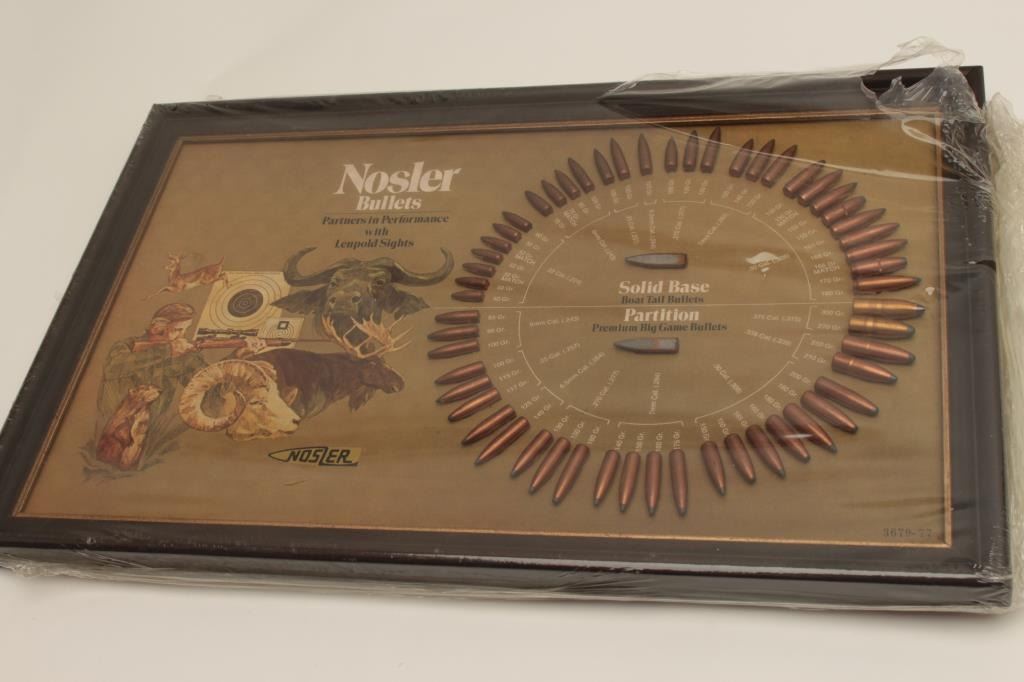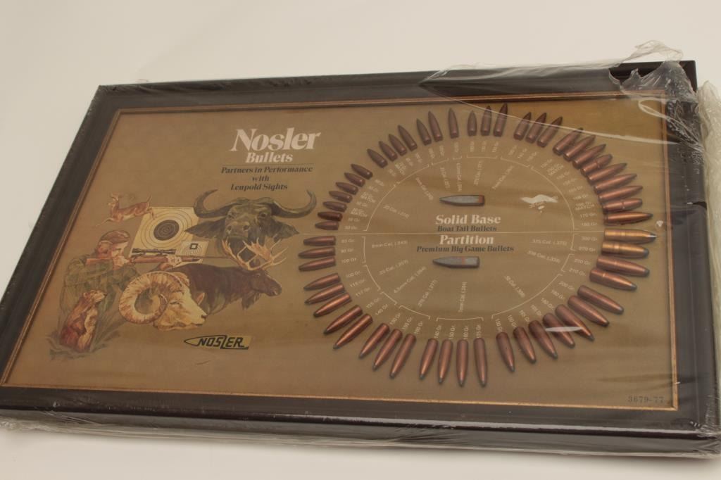 Nosler bullet board featuring Nosler Partition and Solid Base bullets. The framed bullet board is in good condition measuring 19” in length and 12 ¼” in height. The board reads, “Nosler Bullets Partners inPerformance with Leupold Sights.” Great graphics with Sheep, Moose and Cape Buffalo portrayed. The board includes the full range of sizes, weights and calibers in the Nosler line at the time with cross sections of both bullets. Est.: $125-$275.