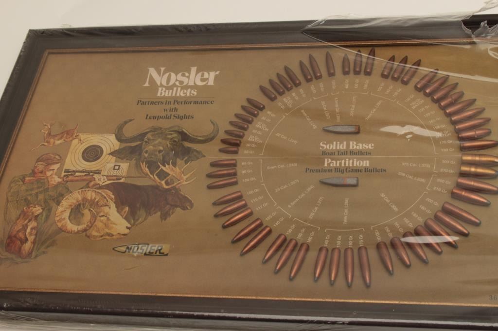 Lot 561 Nosler bullet board featuring Nosler Partition and Solid Base bullets. The framed bullet board is