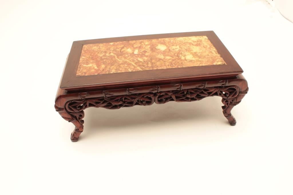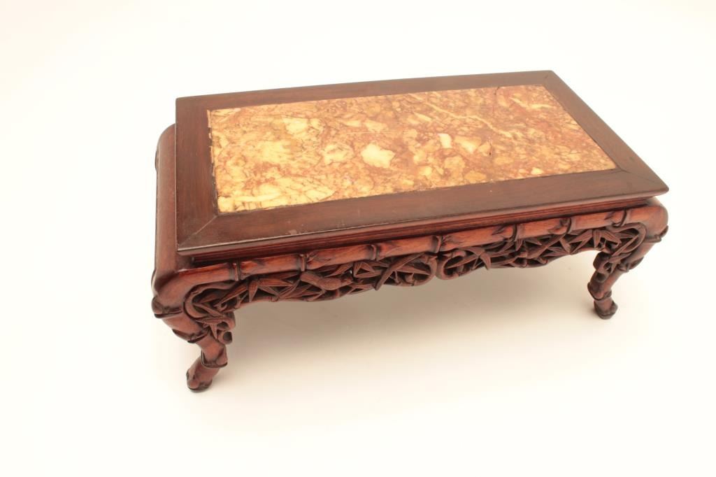 Lot 563 Small “tea ceremony” size carved wood and marble table. Measures 8” in height by 19”. Some crackin
