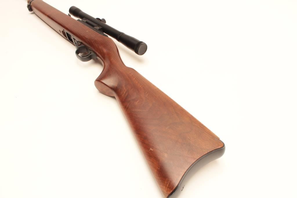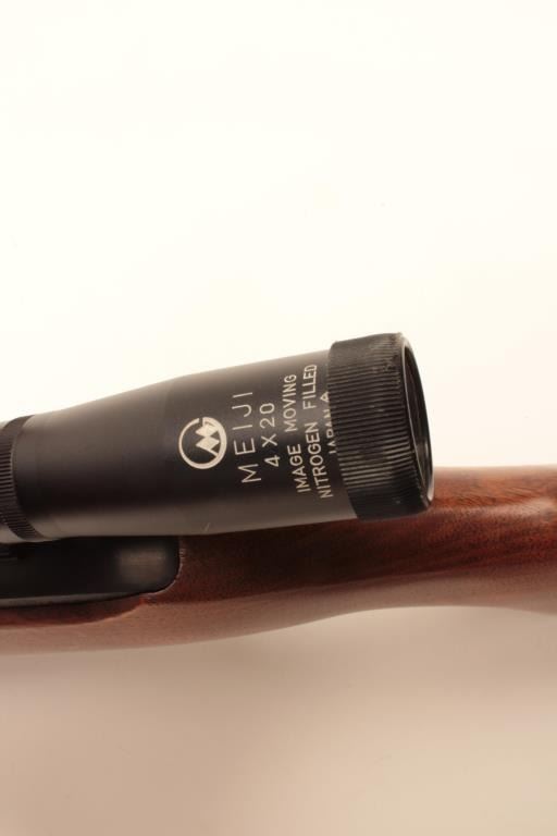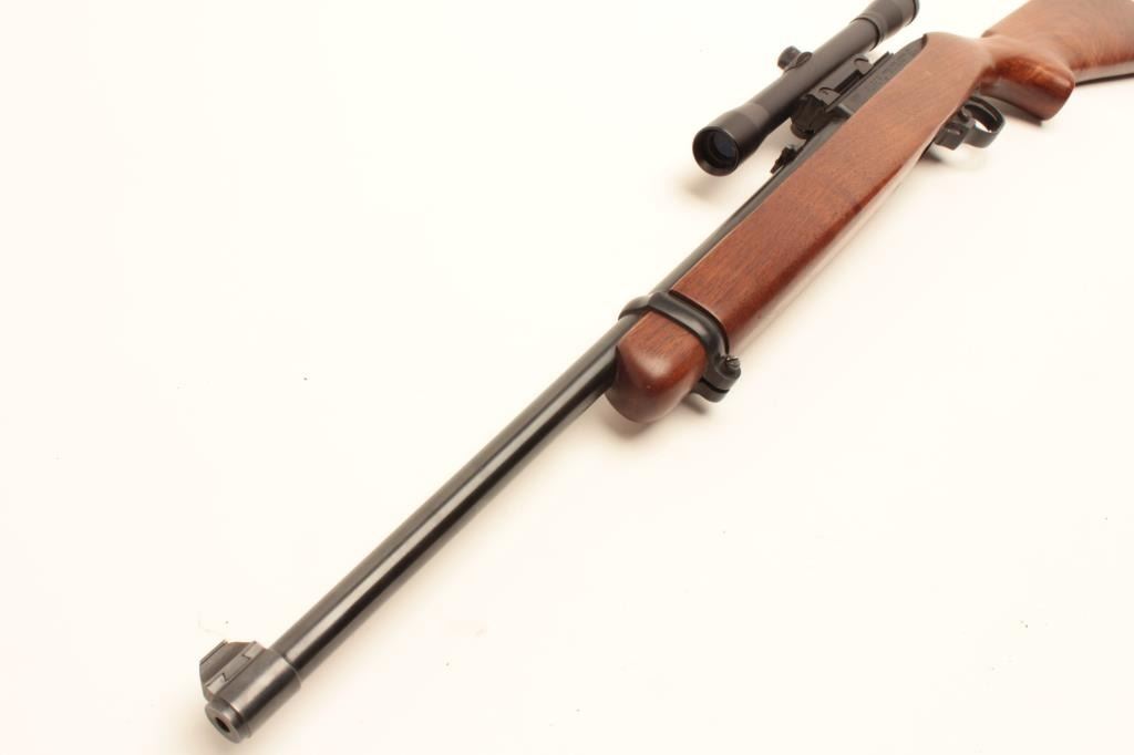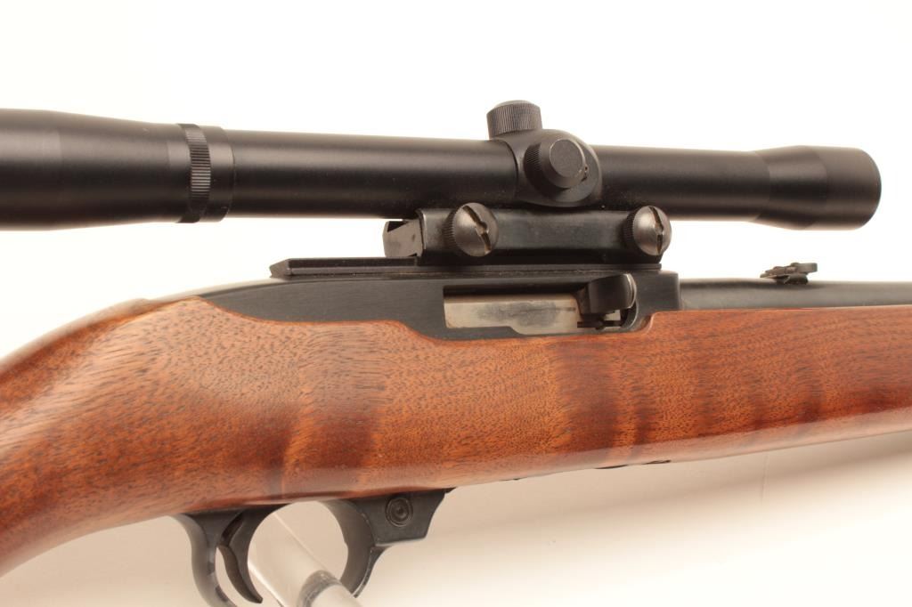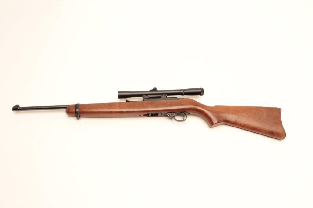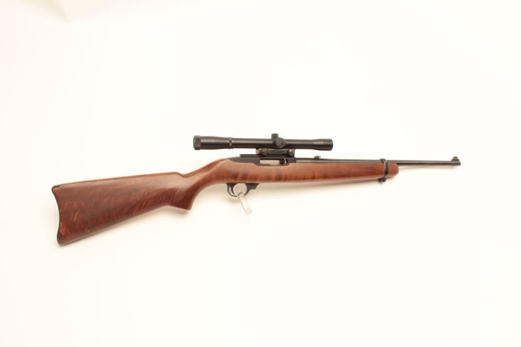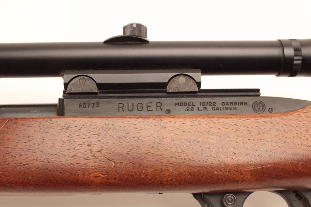 Ruger Model 10/22 semi-automatic carbine, .22LR caliber, 19” barrel, blued finish, wood stock, mounted with an MEIJI 4X20 scope displaying good optics; rifle S/N 65779, in overall very good to fine condition with afine bore, crisp action and markings, fine stock with some scattered scratches from storing; better-than-usual graining in wood; majority of original blue finish. (Modern/No PPT). Est.: $125-$250.