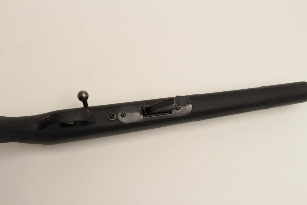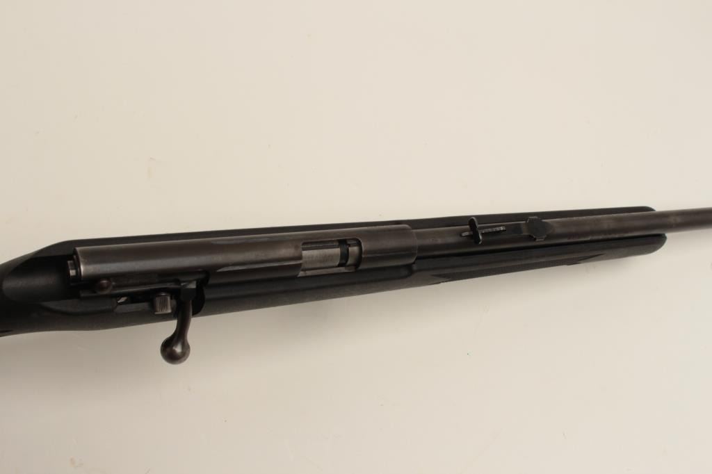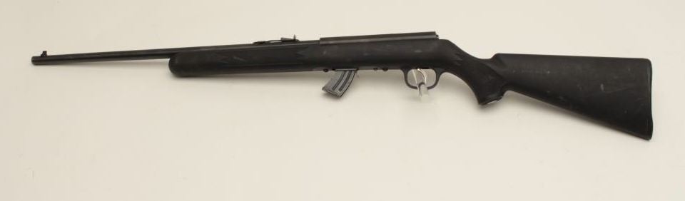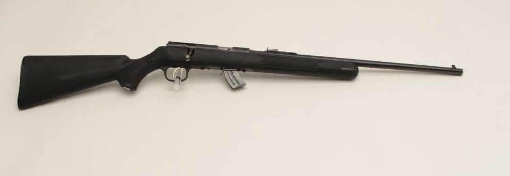 Savage MK II bolt action rifle, .22LR caliber, 21” barrel, black finish, synthetic stock, S/N 0343851, in overall very good to near fine condition with majority of original finish, fine bore, crisp action, sharpmarkings and very good stock. (Modern/No PPT). Est.: $100-$200.