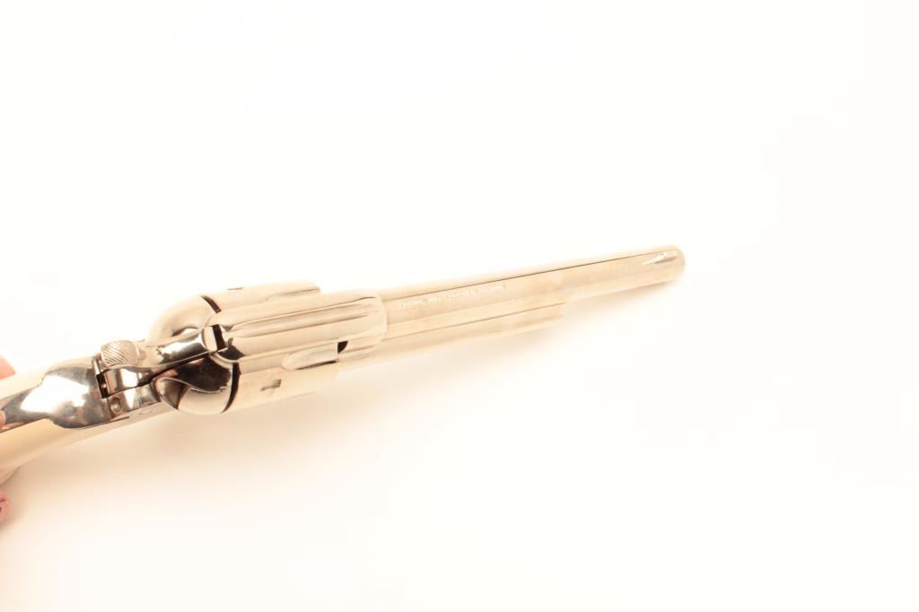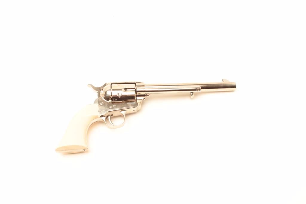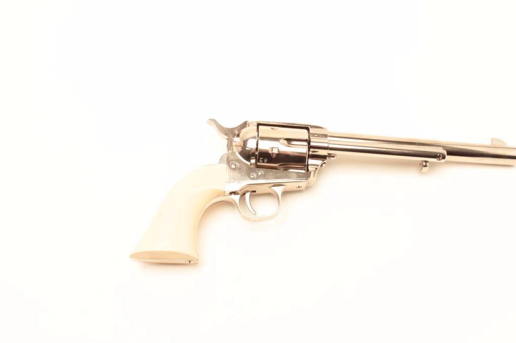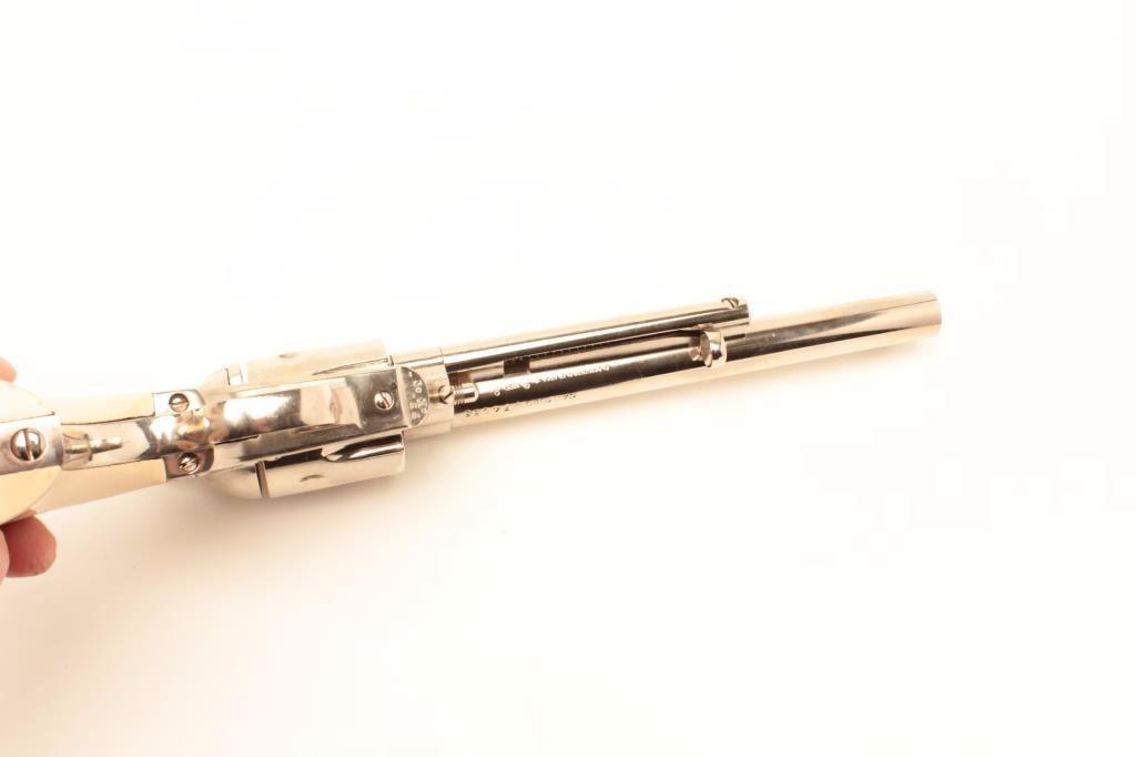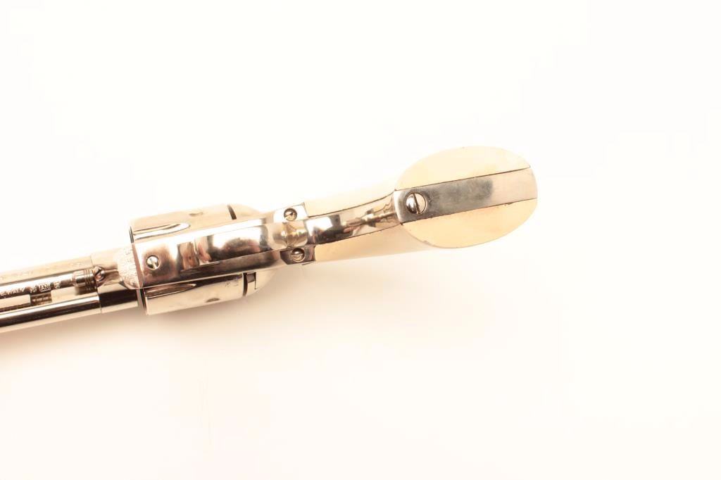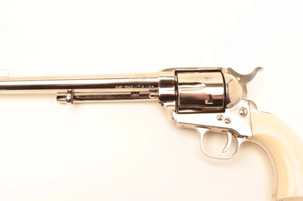 Uberti Modern copy of a Colt SAA revolver, marked on barrel “Allen F.A. Mfg. Co., Santa Fe, NM”, .45 caliber, 7.5” barrel, nickel finish, faux ivory grips, S/N 74055, with factory two-piece cardboard box andinstructions, in overall fine condition with majority of its original finish, fine bore, action, markings and grips. (Modern). Est.: $250-$500.
