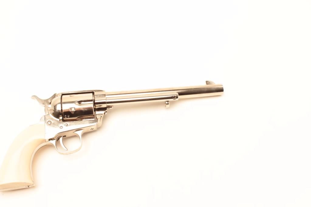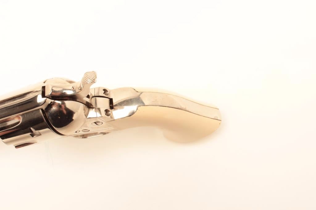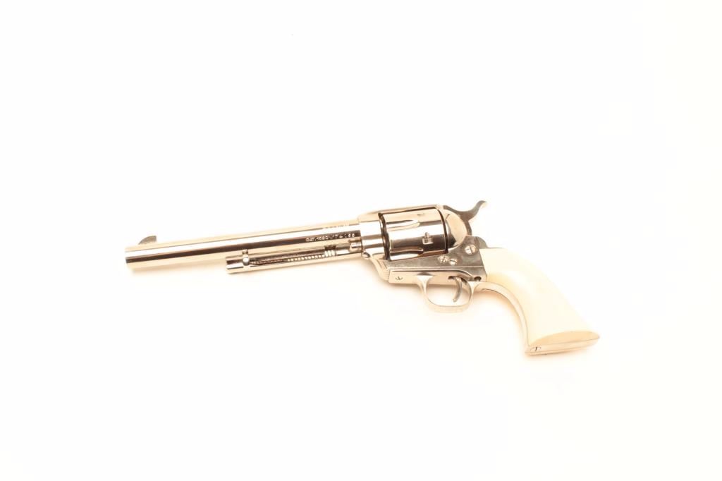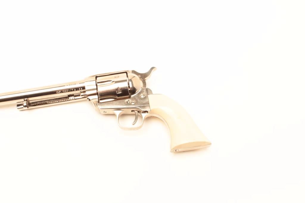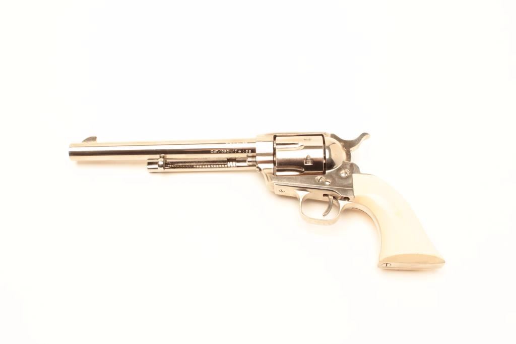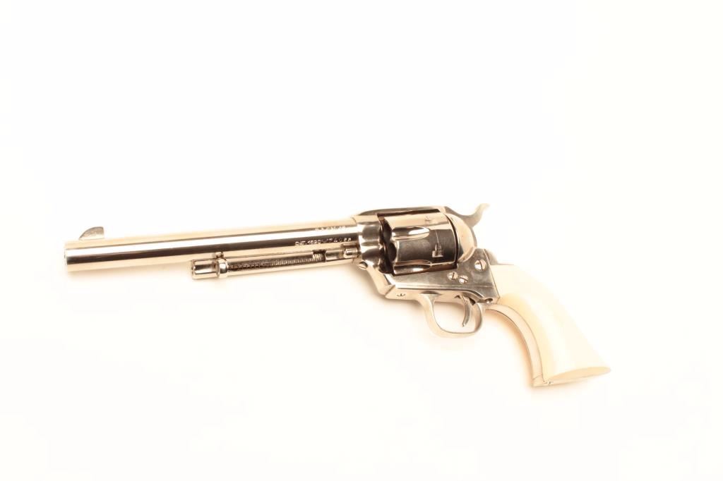 Uberti Modern copy of a Colt SAA revolver, marked on barrel “Allen F.A. Mfg. Co., Santa Fe, NM”, .45 caliber, 7.5” barrel, nickel finish, faux ivory grips, S/N 74055, with factory two-piece cardboard box andinstructions, in overall fine condition with majority of its original finish, fine bore, action, markings and grips. (Modern). Est.: $250-$500.