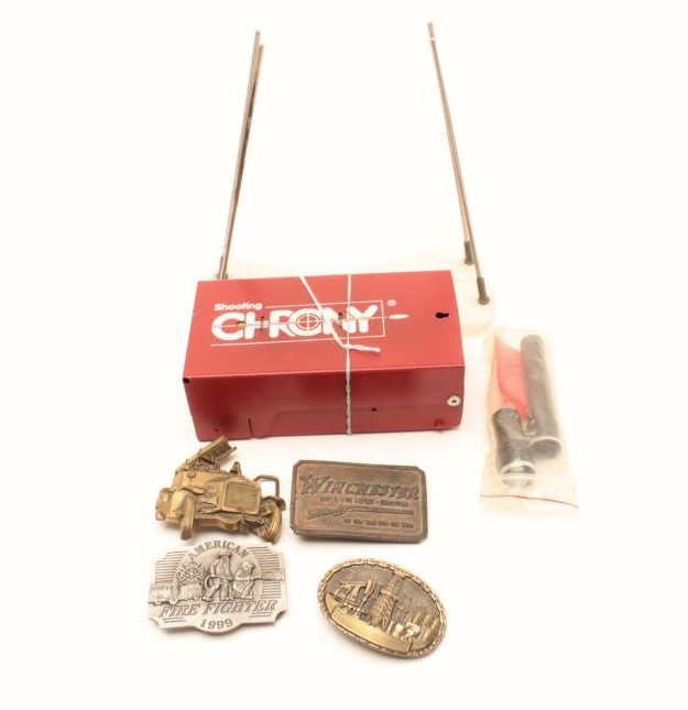 Lot 587 Misc. shooter’s lot including a shooting chronograph, shot gun chokes, and 4 advertising belt buck