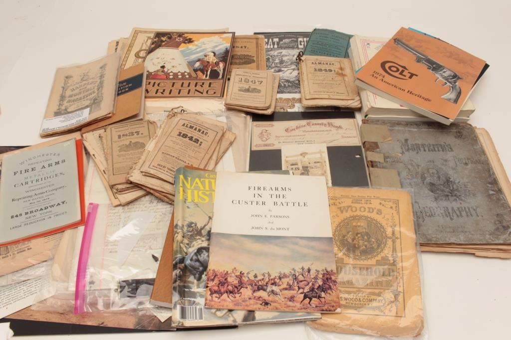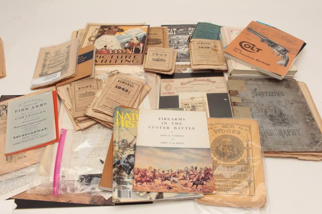 Bonanza lot of misc. pamphlets, old newspapers, catalogs, etc. and a great group of old stock certificates. Est.: $50-$100.