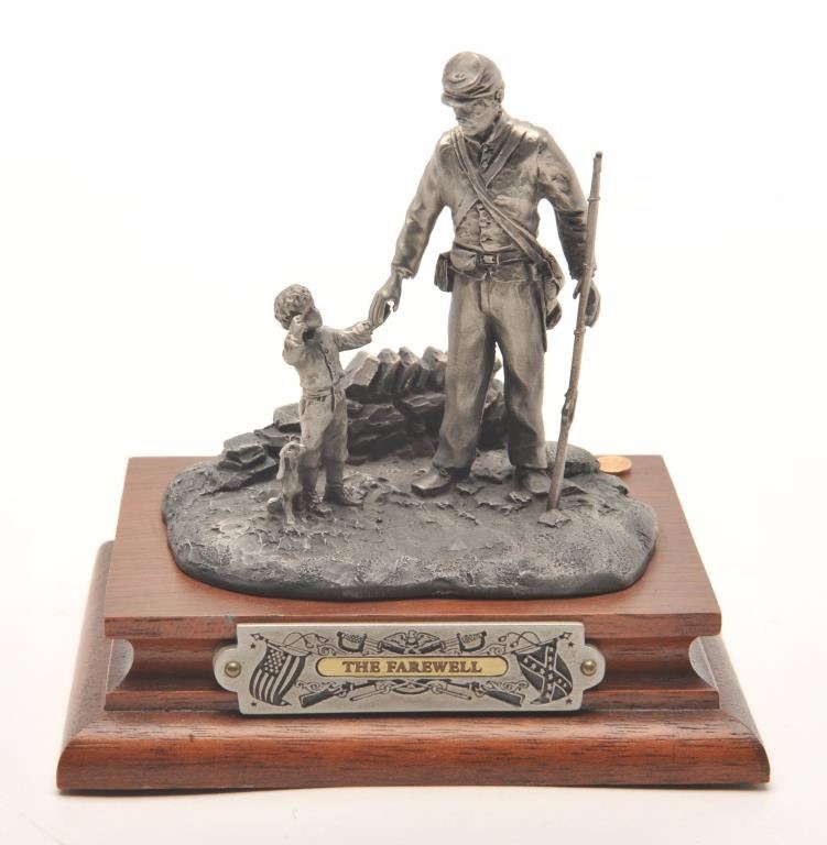 Pewter sculpture by Fran Barnum and issued by Chilmark Collectors Society entitled “A Father’s Farewell”, #007/2500, approximately 4” in height including wood base with Certificate of Registration, signed and dated Apr. 25, 1988. Est.: $100-$200.