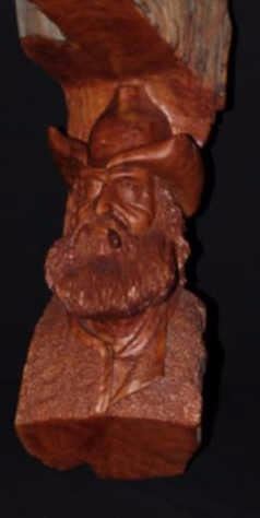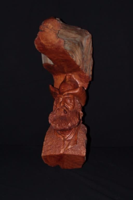 Carved wood figure of man with a cigar and signed “Bob Lundy 1984”. Measures 22”. Well known carver. Est.: $100-$300