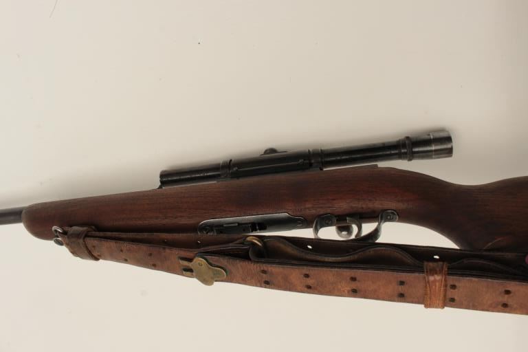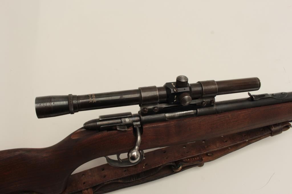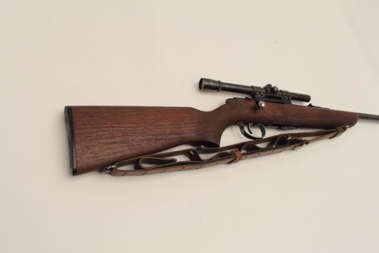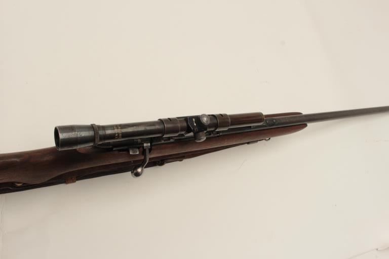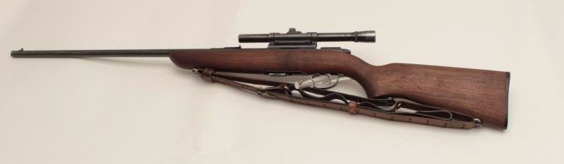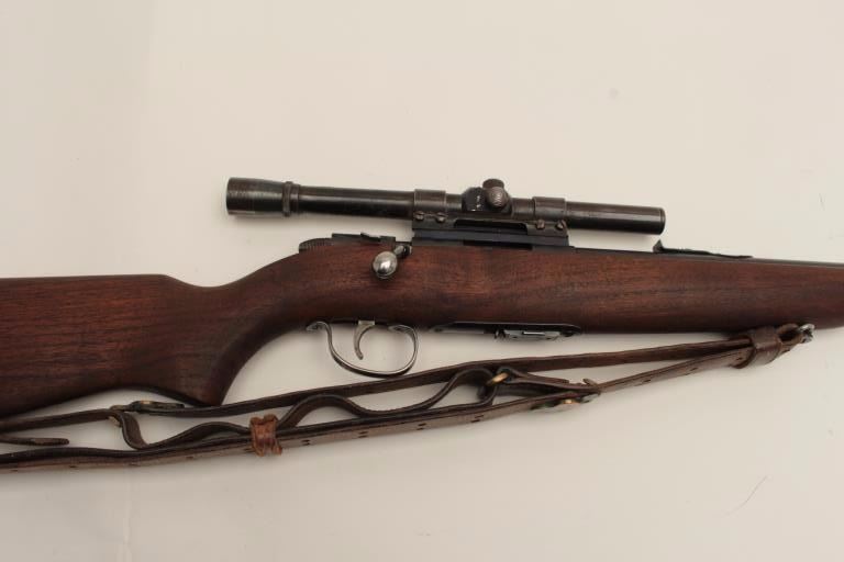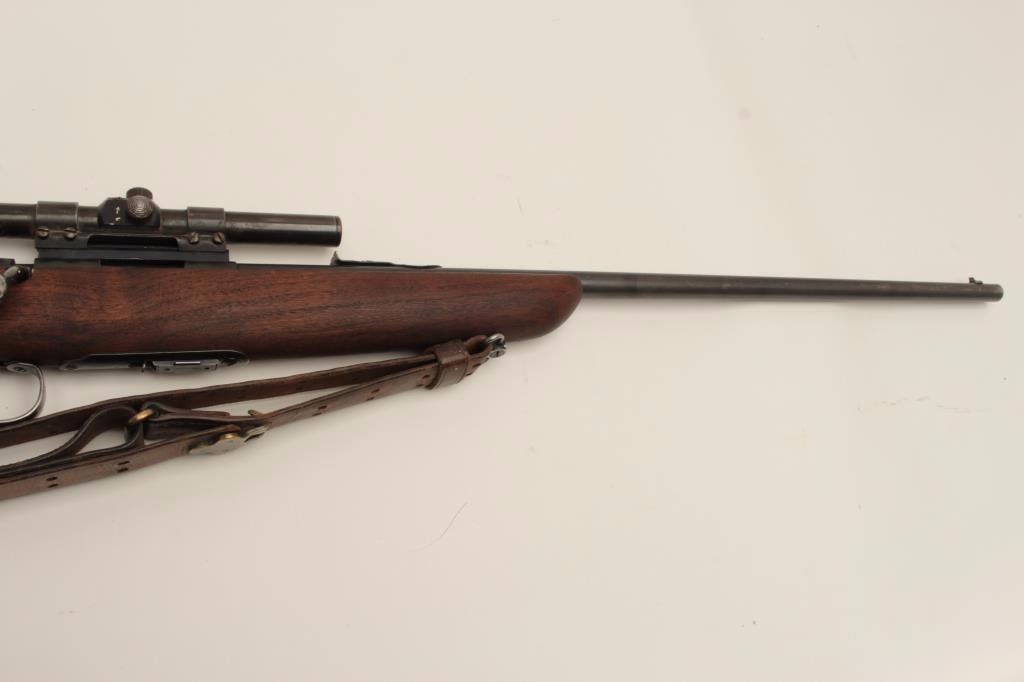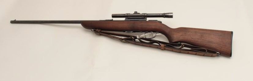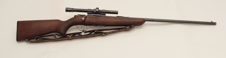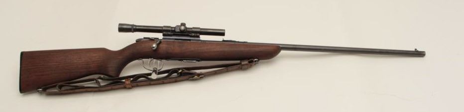Remington ScoreMaster Model 511 bolt action rifle, .22 short, long or LR caliber, 25” barrel, blued finish, wood stock, no visible S/N, mounted with an Apache510-4X scope and leather sling; in overall good condition with good bore, action, markings and wood. (Modern/No PPT). Est.: $90-$180.