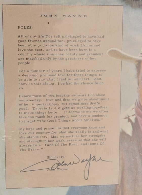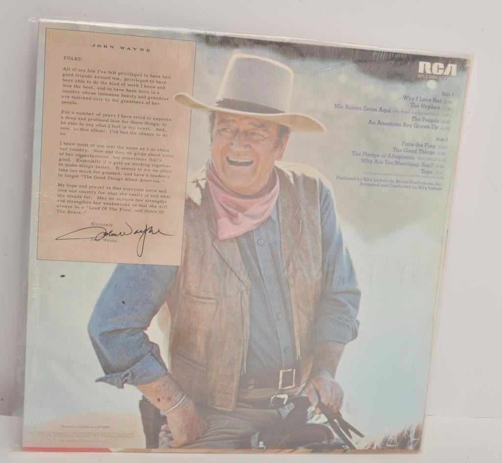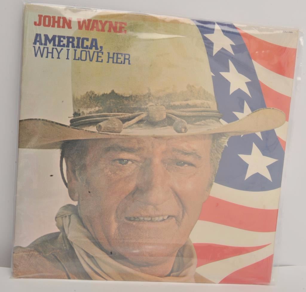John Wayne’s “America, Why I Love Her” vinyl record in sealed original dust cover. Est.: $50-$100.