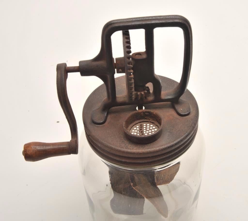 Vintage glass butter churn, ca. 1900’s; approximately 13” in height; great decorator! Est.: $50-$100.