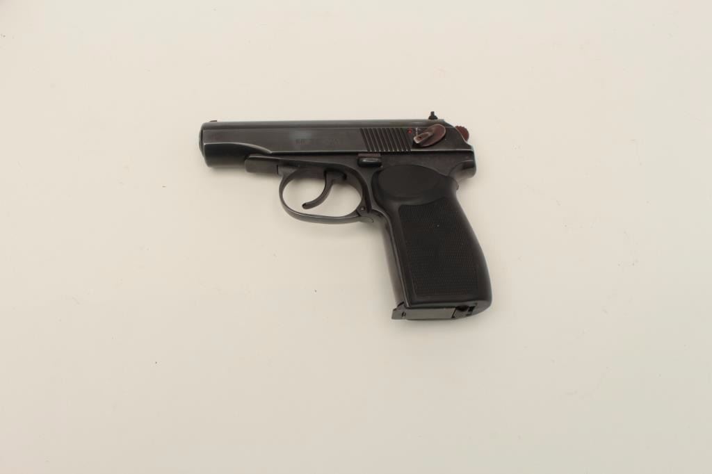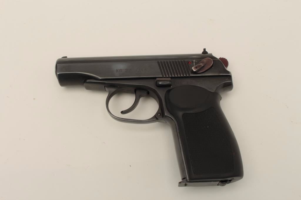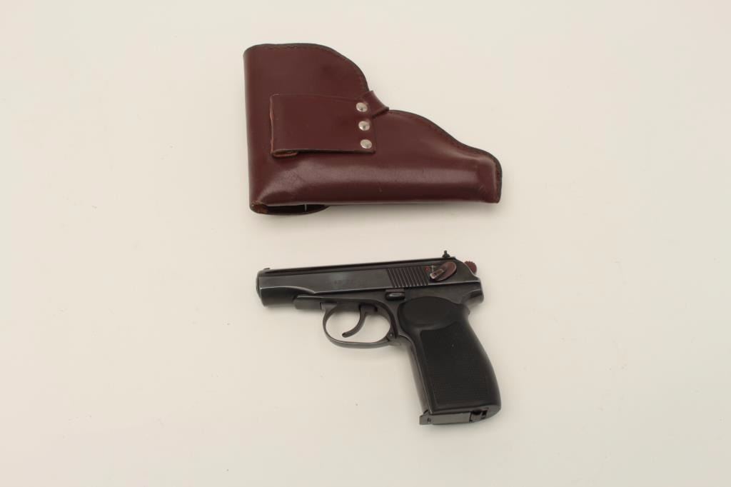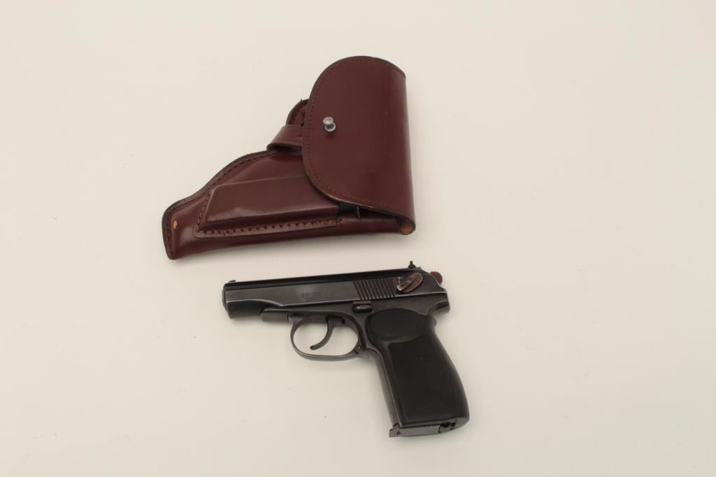 Makarov DA semi-automatic pistol, import-marked, 9mm caliber, 3.5” barrel, checkered rubber grips, S/N KO 27 3744, in overall very good condition with a very good + bore, crisp action, very good grips andaccompanied by a brown leather flap holster with one extra magazine. (Modern/PPT). Est.: $125-$250.