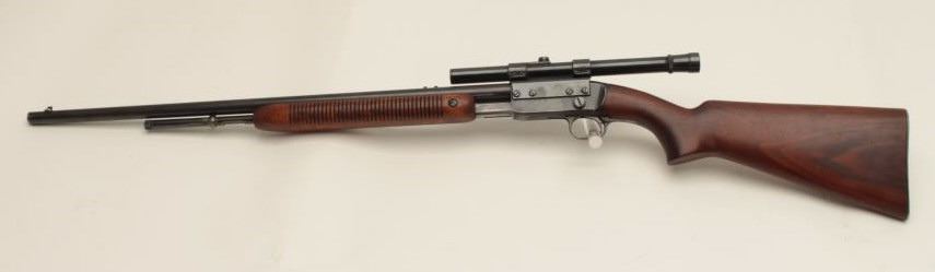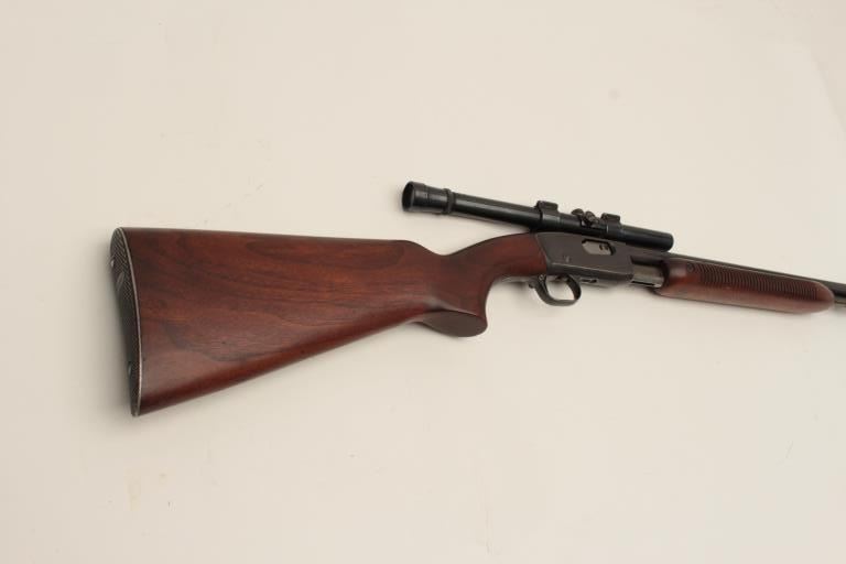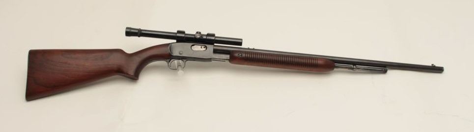 Remington Model 121 FieldMaster semi-automatic rifle, .22 short, long or LR caliber, 24” barrel, blued finish, wood stocks, S/N 1929, mounted with a Weaver scope displaying good optics. This rifle is inoverall good condition with lots of original muted blue, good action and markings, good to very good wood; consignor notes barrel has a slight bulge (we had hard time seeing it) but “still shoots very well”. (C&R/NoPPT). Est.: $125-$250.