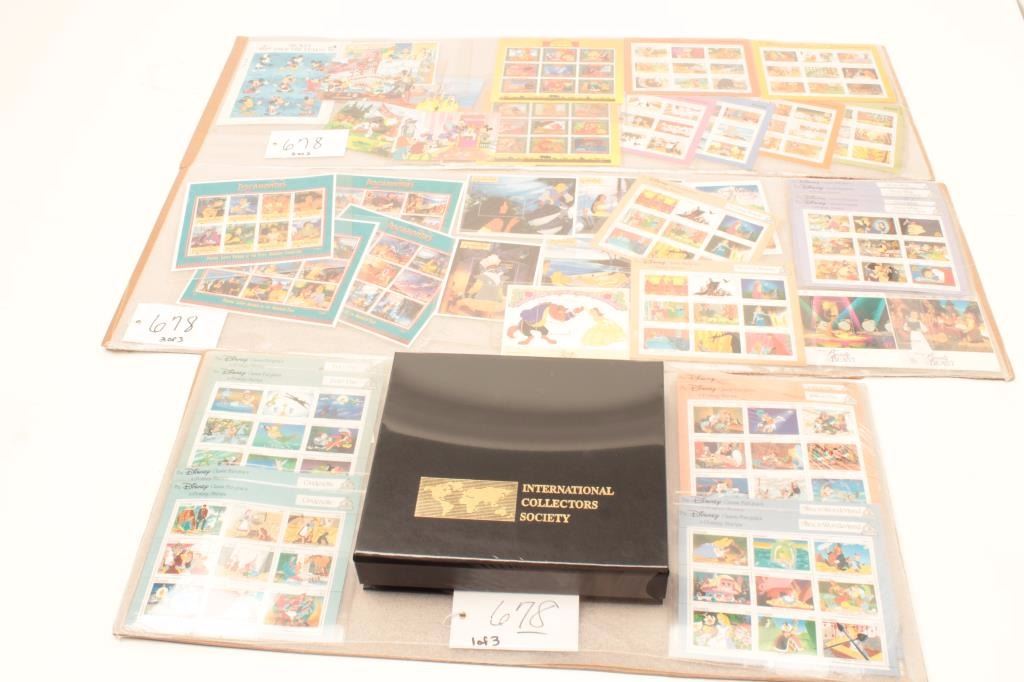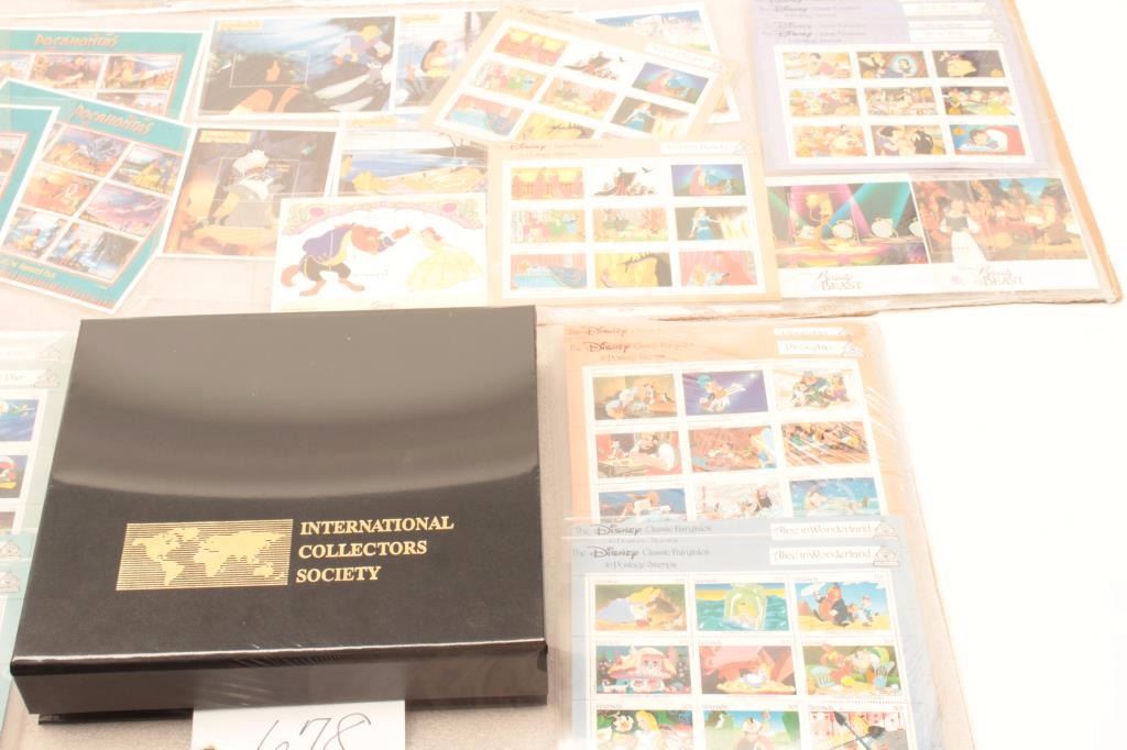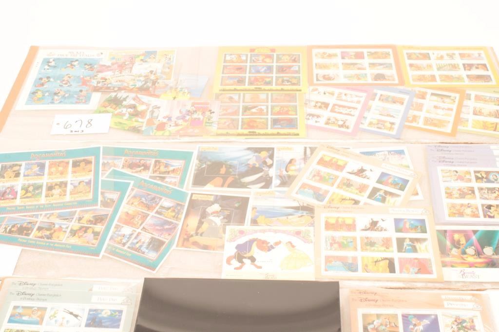 Lot of Disney memorabilia consisting of stamps and cards showing Beauty and the Beast, Lion King, Mickey Mouse, Pocahontas, and Snow White. Purchased 1980’s-90s. 43 pieces. Est.: $50-$100