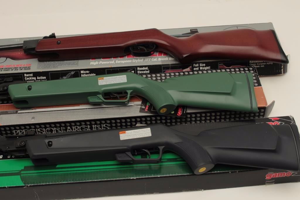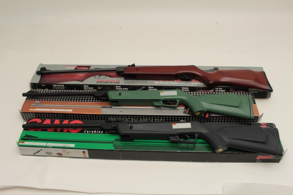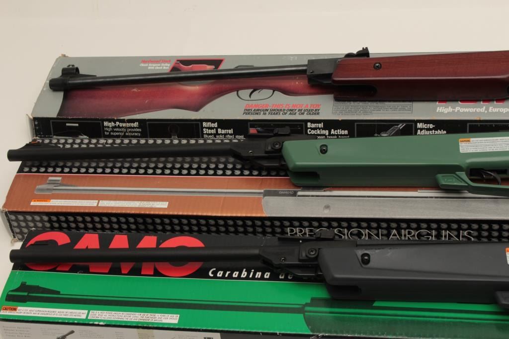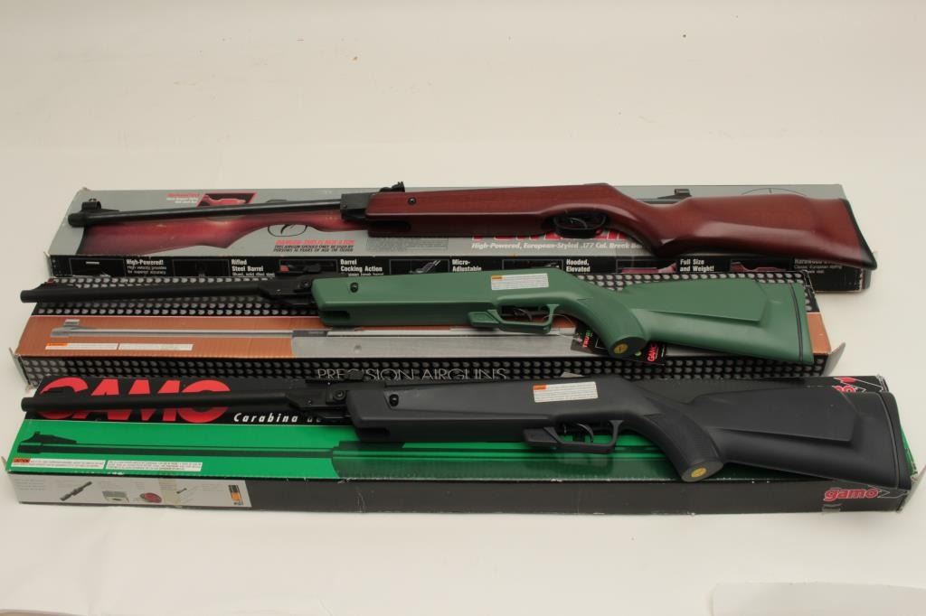 Lot 684 Lot of 3 pellet rifles including a Gamo Ducks Unlimited in factory cardboard box with green compos