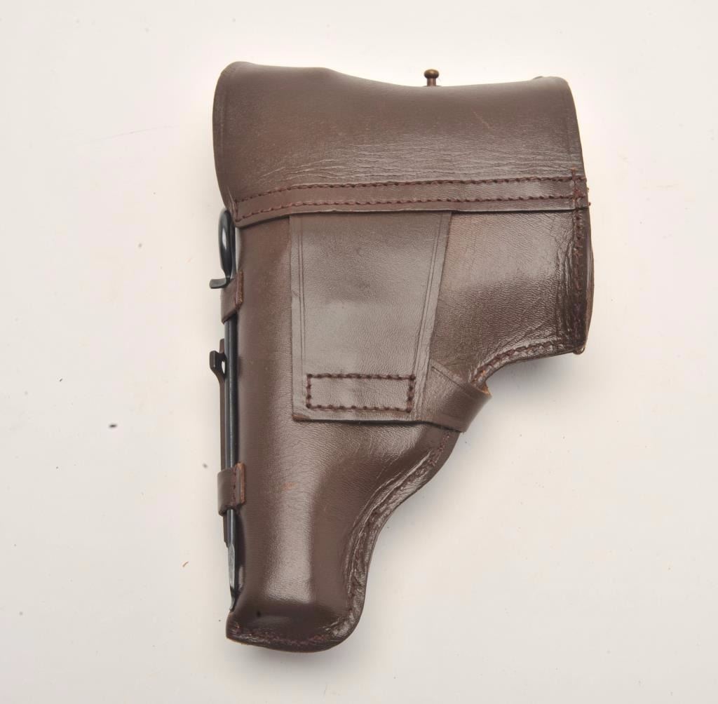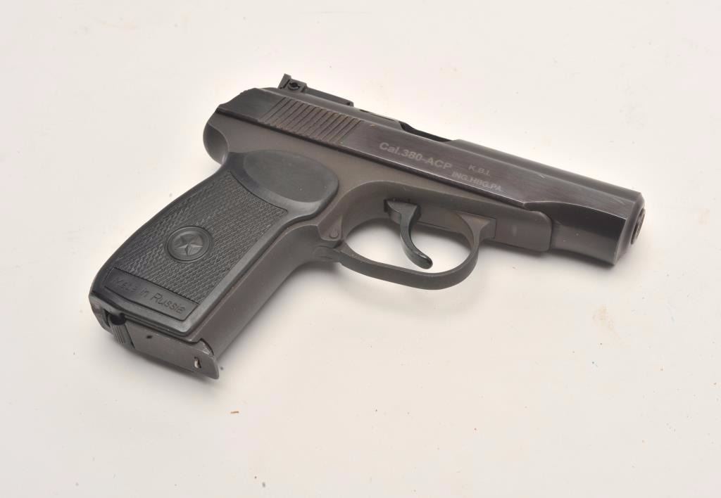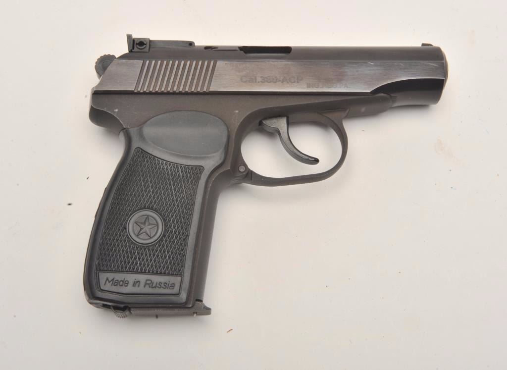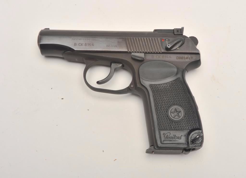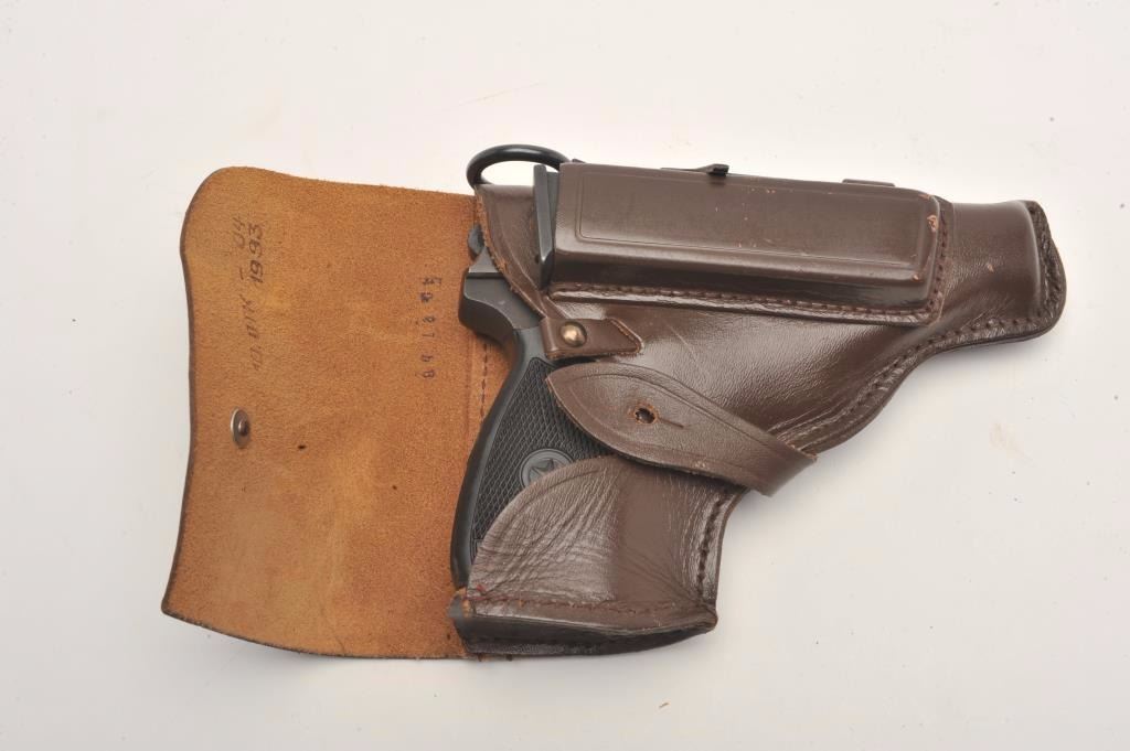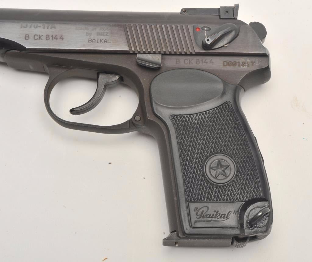 Russian Baikal DA semi-automatic pistol by IMEZ, import-marked, .380 ACP caliber, 3.5” barrel, blued finish, checkered grips, S/N D001017, in overall fine condition showing little use; with leather flap holster and one extra magazine. (Modern/No PPT). Est.: $125-$250.