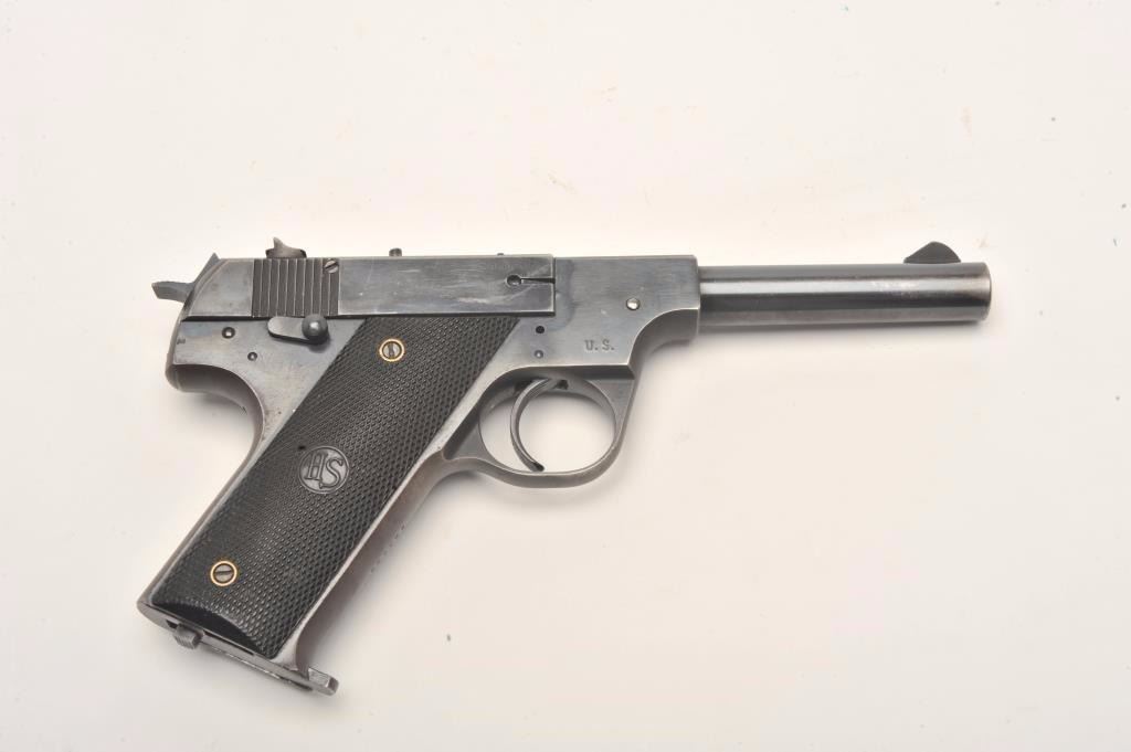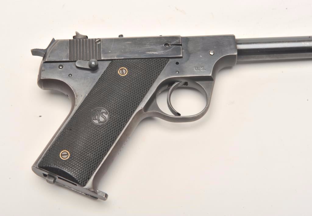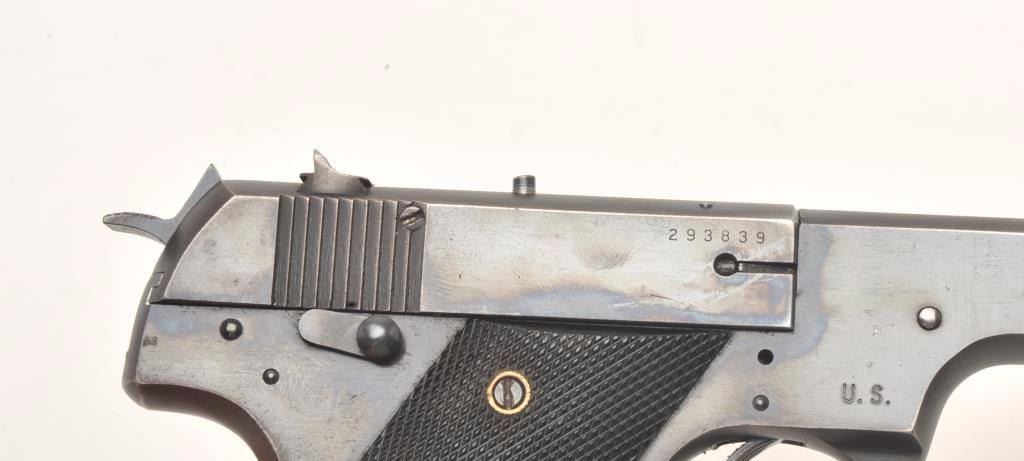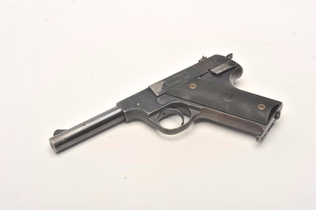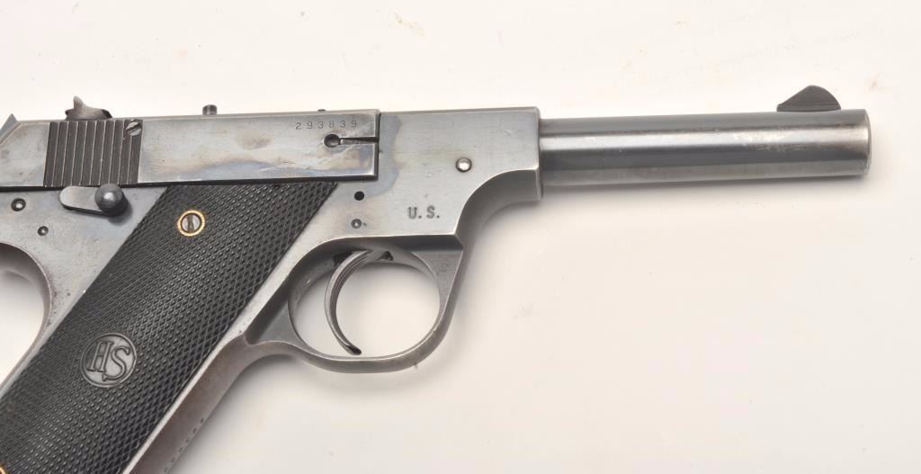 Hi Standard Model HB semi-auto pistol, .22 Long Rifle caliber, Serial #293839. The pistol is in very good overall condition with a 4 ½” barrel. The pistol retains the majority of its blued finish with losses offinish along the barrel, at the muzzle and on the slide. The left side of the frame is marked U.S. The checkered plastic grips are in very good condition with small mars and handling marks. The bore is good, the action crisp and markings are sharp. The lot includes one correct magazine. From the estate of Larry Gaertner. Est.: $400-$800. (C+R)