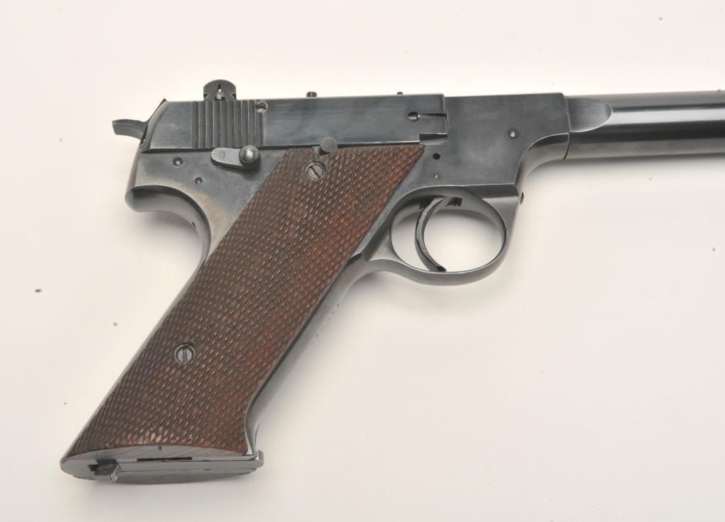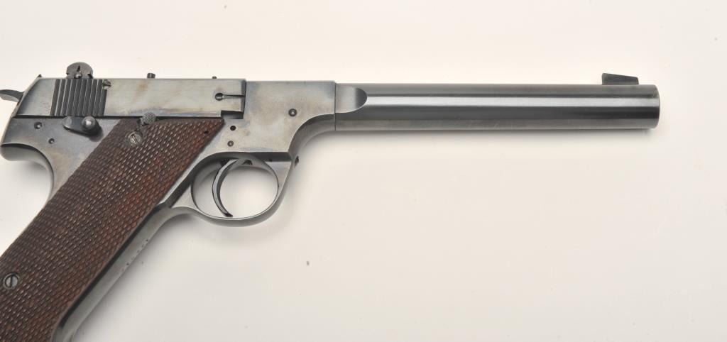 Hi Standard Model HD Military semi-auto pistol, .22 Long Rifle caliber, Serial #293839. The pistol is in very good overall condition with a 7 5/8” heavy target barrel. The pistol retains approximately 95% of itsblued finish with only light wear at the muzzle noted. The checkered wood grips are in very good condition with small mars and handling marks. The bore is very good, the action crisp and markings are sharp. The lot includes one correct magazine. From the estate of Larry Gaertner. Est.: $400-$800. (C+R)