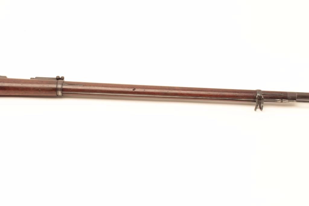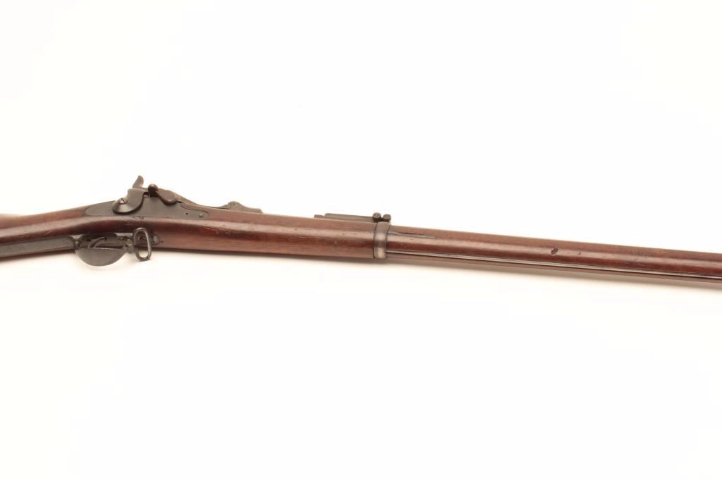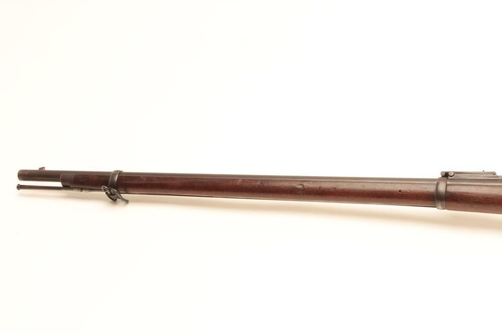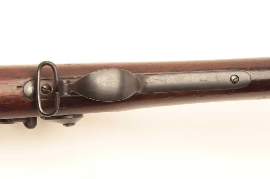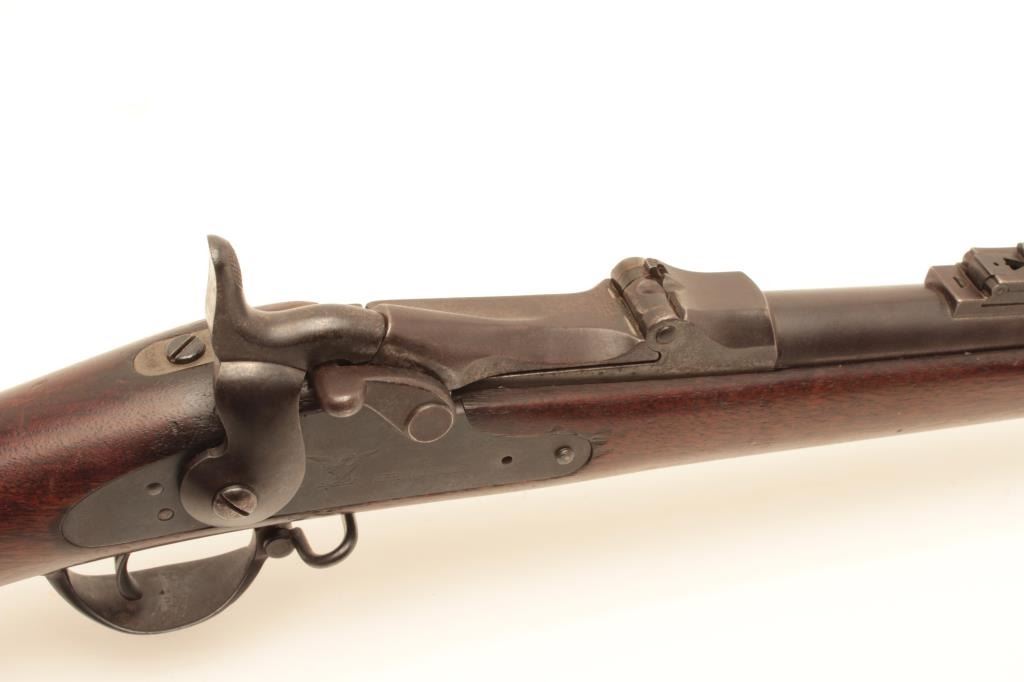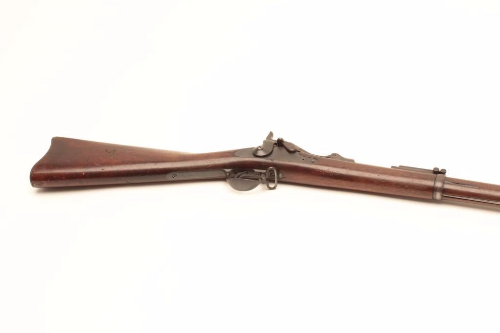 Springfield Trapdoor Model 1884 single shot rifle, .45 caliber, Serial #165298. The rifle is in very good overall condition with a 32” barrel with square post front and military tangent style rear sights. Thebarrel retains a significant amount of its thinning blue finish with wear at the muzzle. The receiver is going dark with silvery toning evident. The smooth wood stock is in good condition with mars, compressions, anold rack number painted on the butt and the letter, “M” scratched into the left side. The butt stock includes a ramrod, sling swivels and ends with a smooth, steel crescent butt plate. The bore is good, theaction crisp and markings are sharp. From the estate of Larry Gaertner. Est.: $500-$1,000. (Antique)