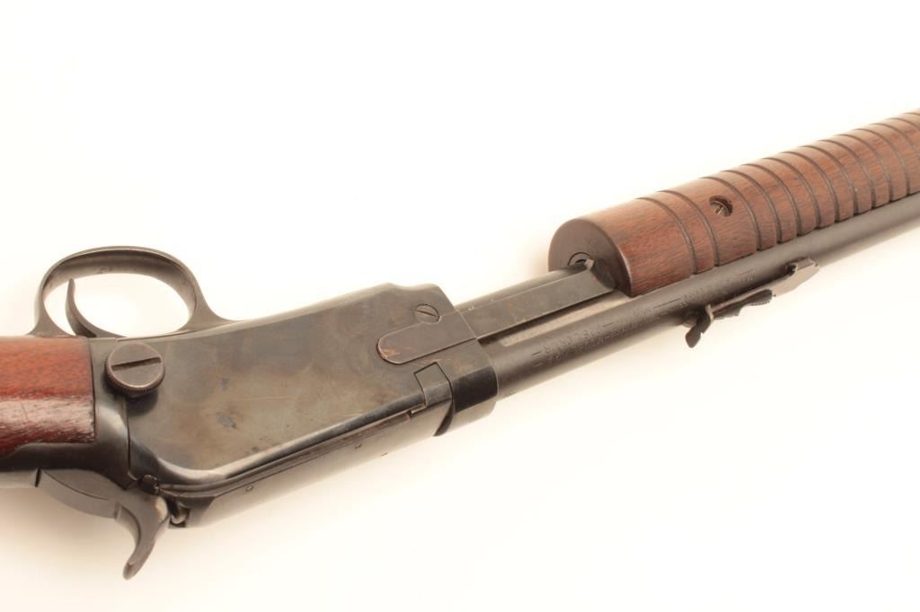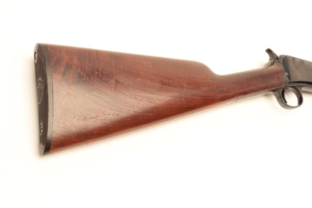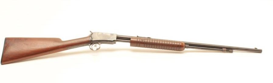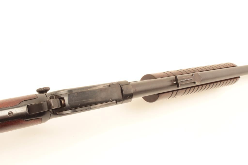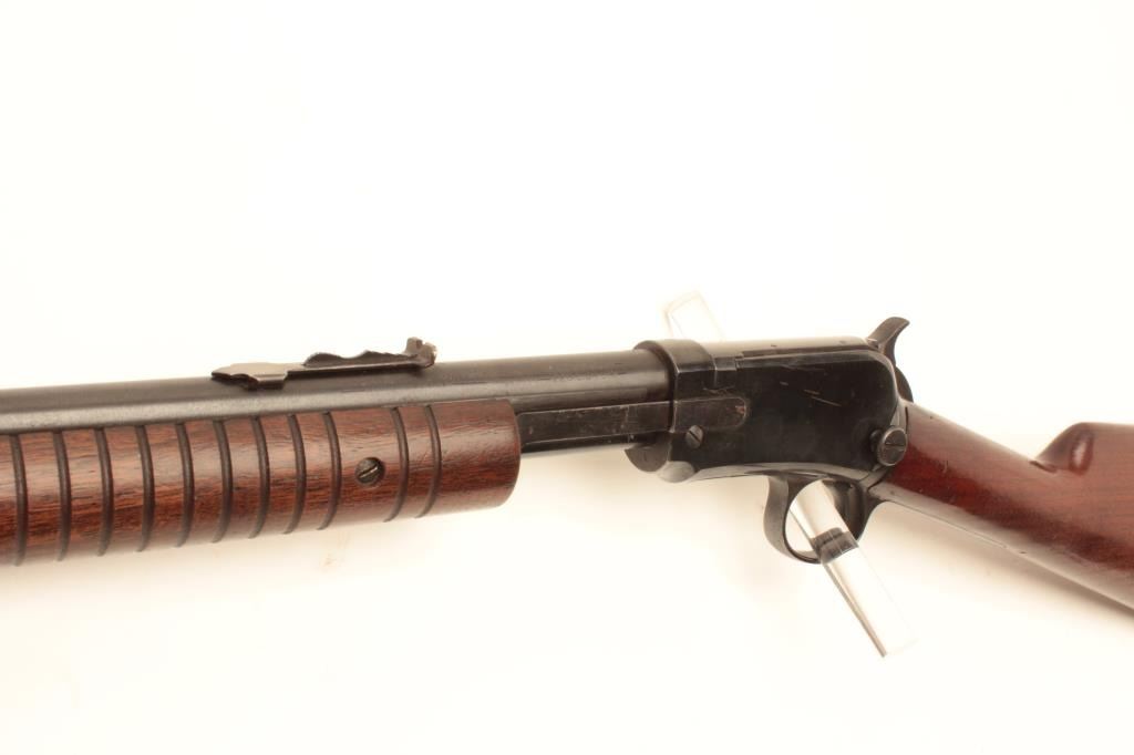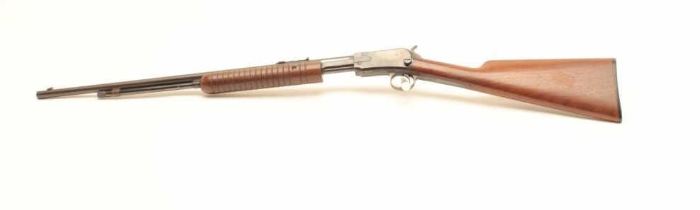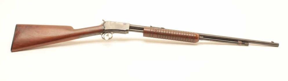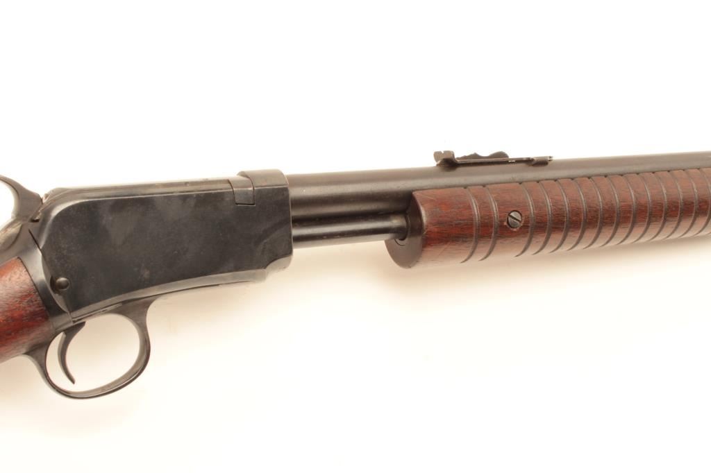 Winchester Model 62A take down pump action rifle, .22 S.L. or L.R. caliber, Serial #126165. The rifle is in fine to nearly excellent overall condition with a 23” round barrel with a post front and standard rearsights. The barrel and ¾ length magazine retain nearly all of their original blue finish. The receiver shows approximately 90% of its blue finish with several small scratches on the left side of the action.The smooth wood stocks are in very good condition showing little use. The butt stock ends with a hard rubber, Winchester marked butt plate. The bore is very good, the action crisp and markings are sharp on thisdesirable, lightly used Winchester manufactured in 1941. From the estate of Larry Gaertner. Est.: $350-$700. (C+R)