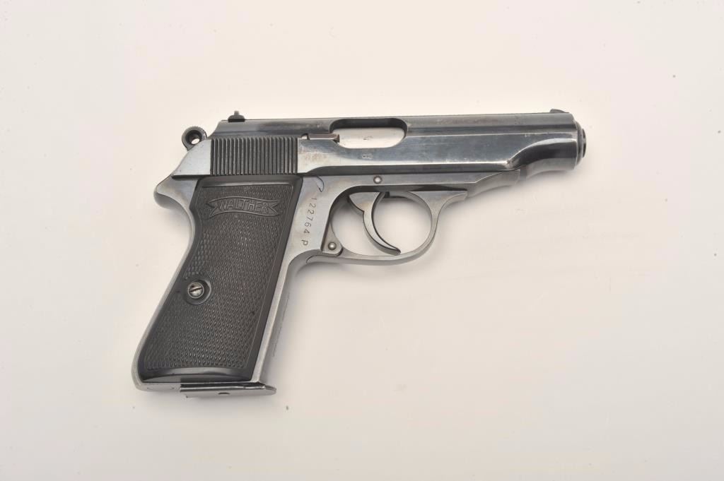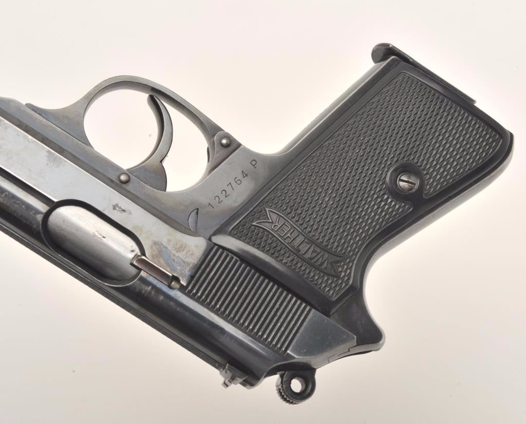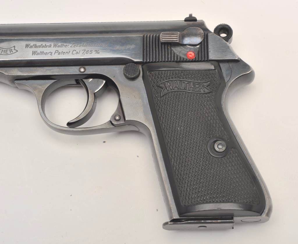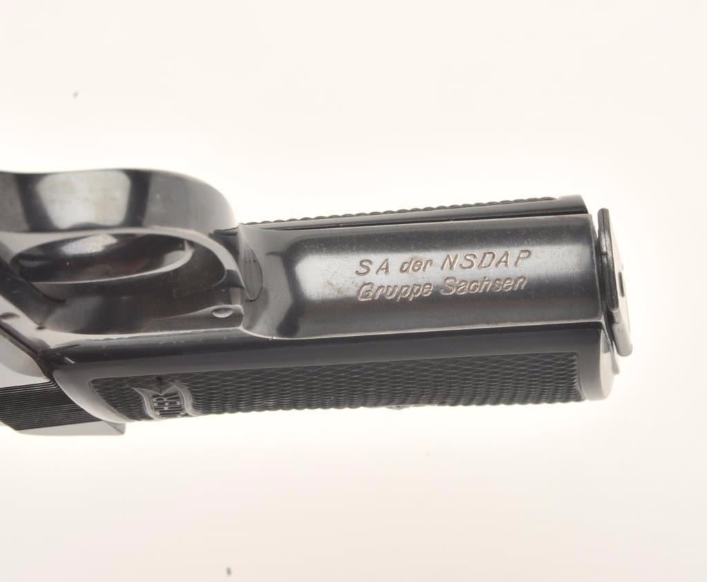 Walther Model PP semi-automatic pistol, 7.65mm caliber, 3.75” barrel, blued finish, checkered plastic grips, rare marking on front grip strap “SA der NSDAP/Gruppe Sachsen”, S/N 122764P, in overall very goodto fine condition displaying the majority of its original finish, very good + bore, crisp action and markings, fine grips. (Modern/PPT). Est.: $500-$1,000.