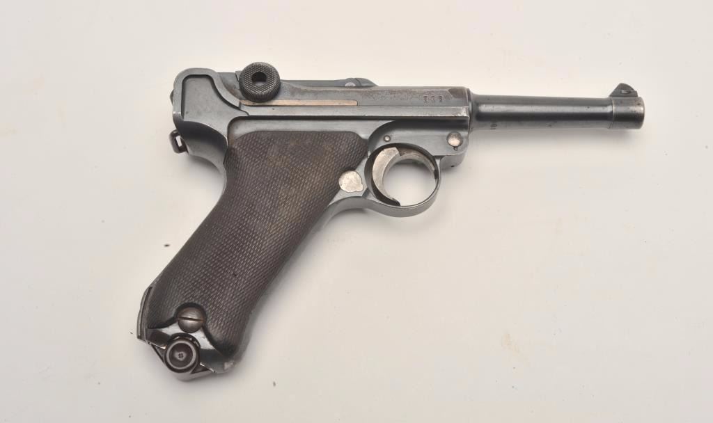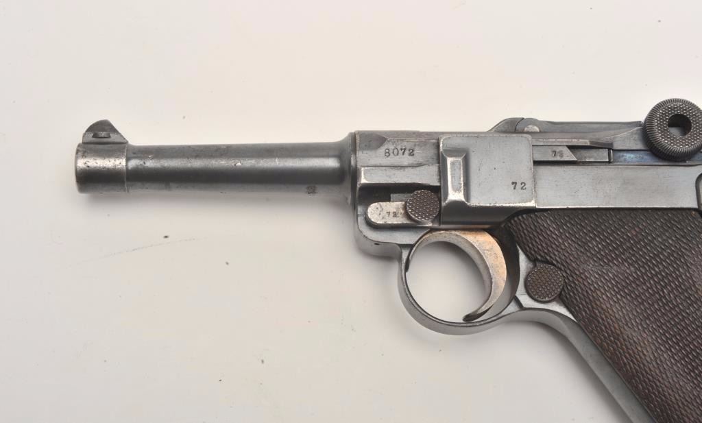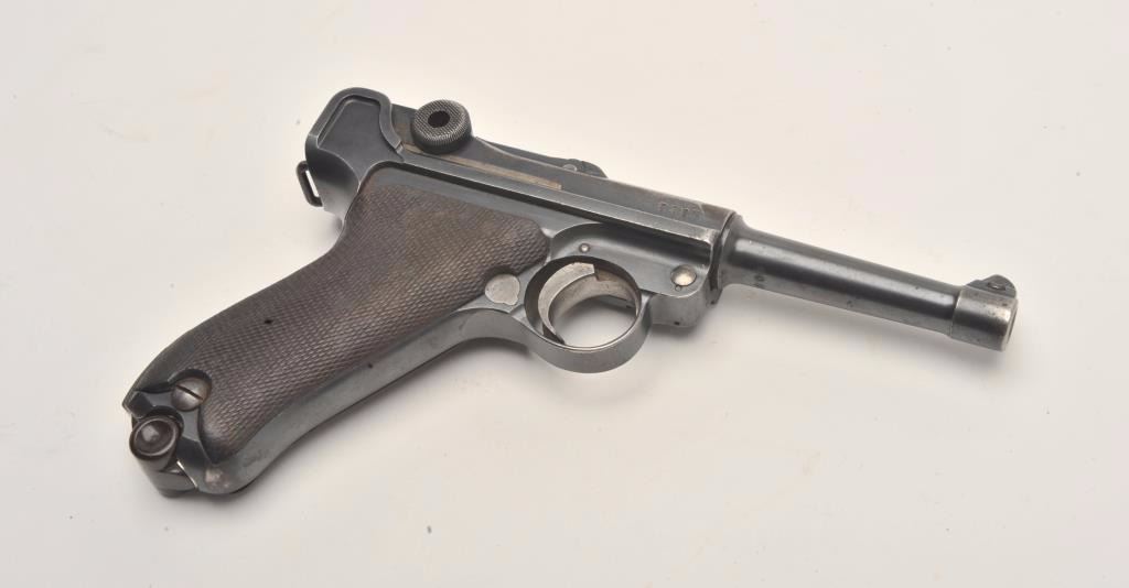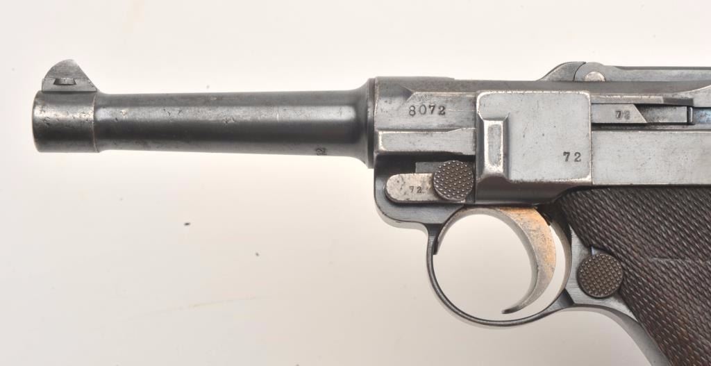 DWM Luger semi-auto pistol, 9mm caliber, Serial #8072. The pistol is in good overall condition with a 4” barrel. The pistol retains the majority of its military blued finish with all visible serial numbersmatching. Additionally, the pistol has, “160” stamped at the rear of the slide, perhaps an arsenal numbering during the period of service. The front ring is dated 1915 and the trigger shows muted strawfinish. The checkered wood grips are in good condition with some flattening of the checkering and small mars. The magazine is marked, “MADE IN SWITZWERLAND”. The bore is good, the markings are sharp and action crisp on this desirable World War I era Luger. Est.: $400-$800. (C+R).