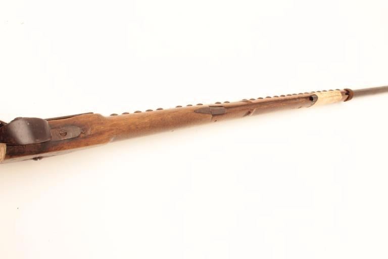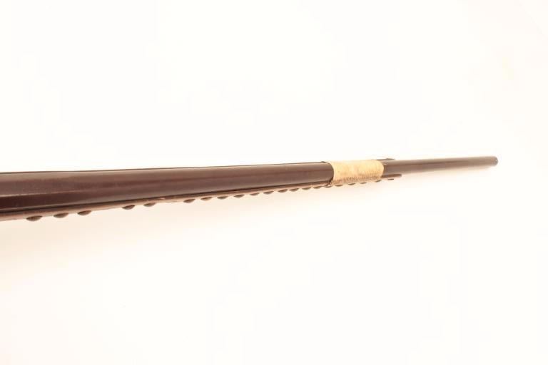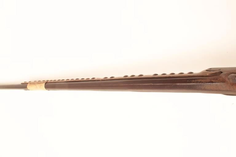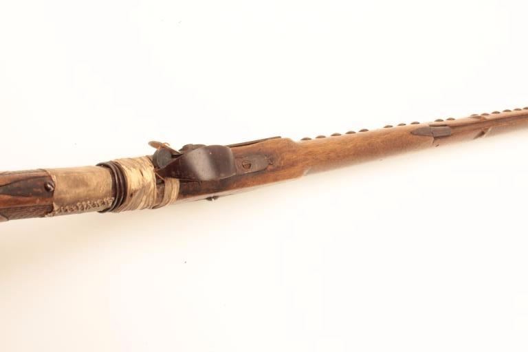 Flintlock fowler circa 18th century converted to percussion in the 19th century showing Native American Indian tacking, hide and wire wrapped decoration from the 19th century. Shows private collection tag “Fenn” of FennGallery Santa Fe, New Mexico. Measures 52 ½” overall with about a 16GA smoothbore. Fenn of Fenn Galleries was an early art dealer who collected American Indian artifacts that were decorated. He had a great eye and superiorknowledge and was active from 1950’s to 90’s. He was the definitive expert on the art of Joseph Sharpe and wrote a book on the subject. Uncleaned and quite “Real” not a tourist piece. (Antique) Est.: $1500-$3000