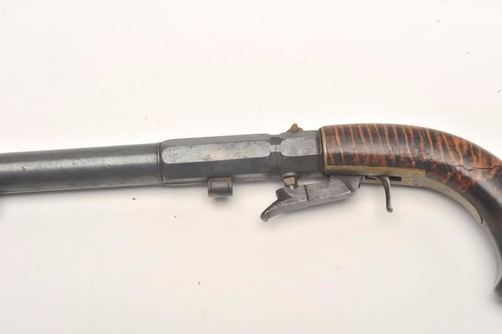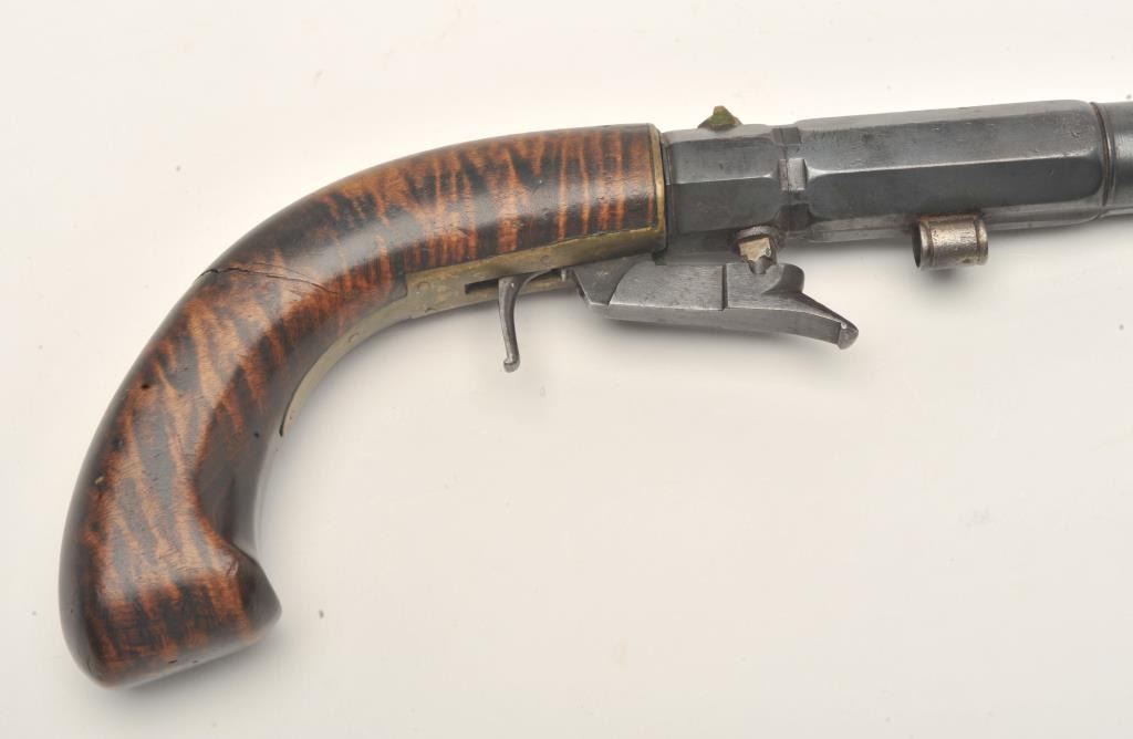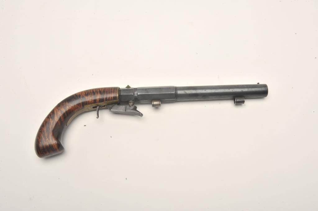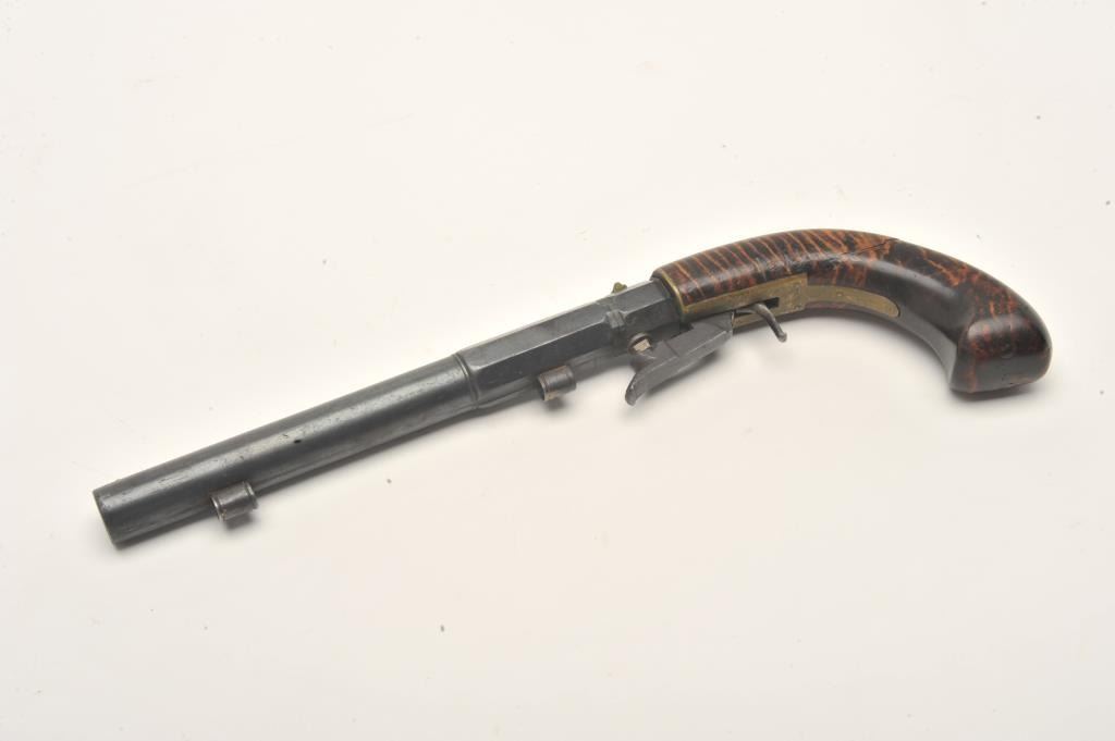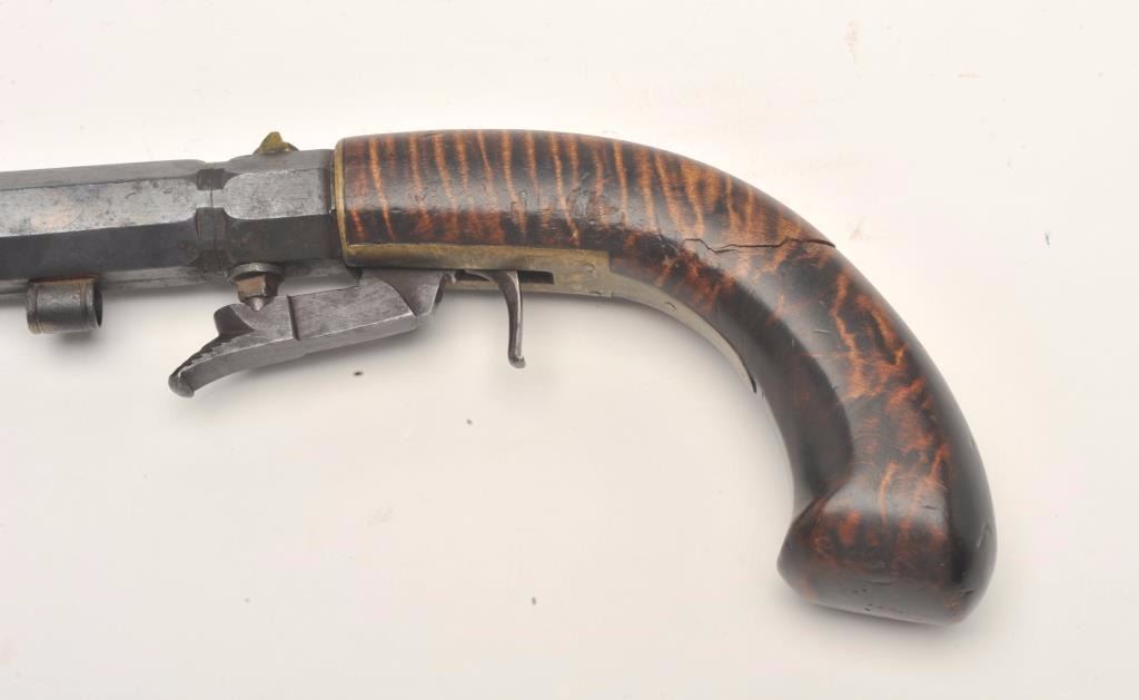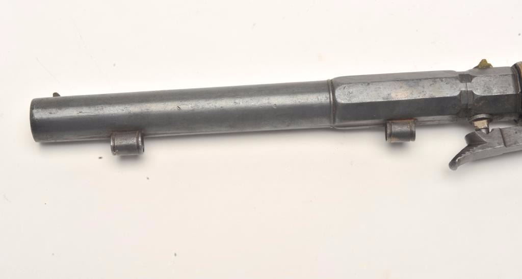 Lot 720 Underhammer American percussion pistol, .32 caliber, 7” barrel, blued finish, wood grips, missing