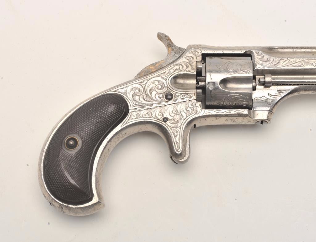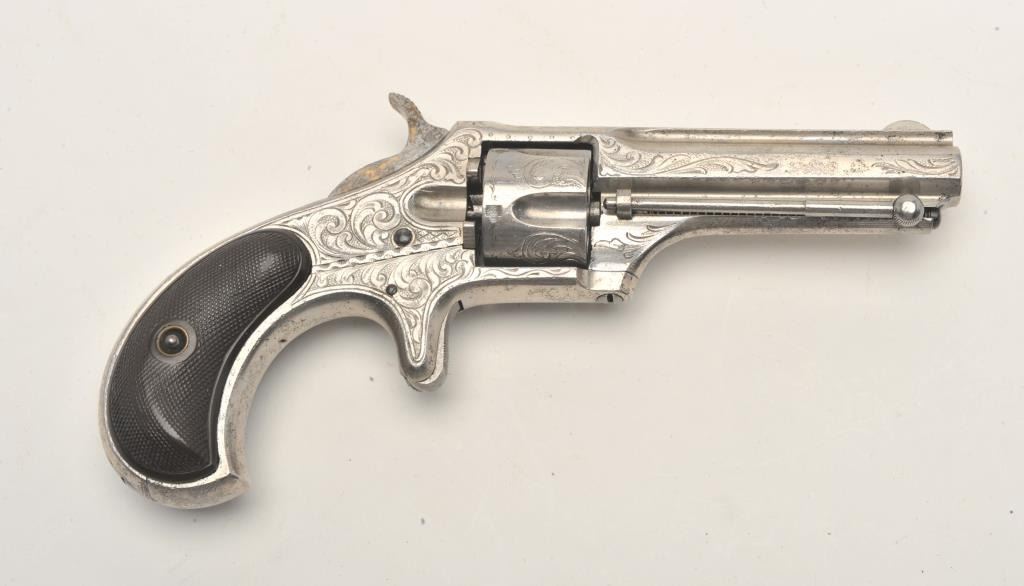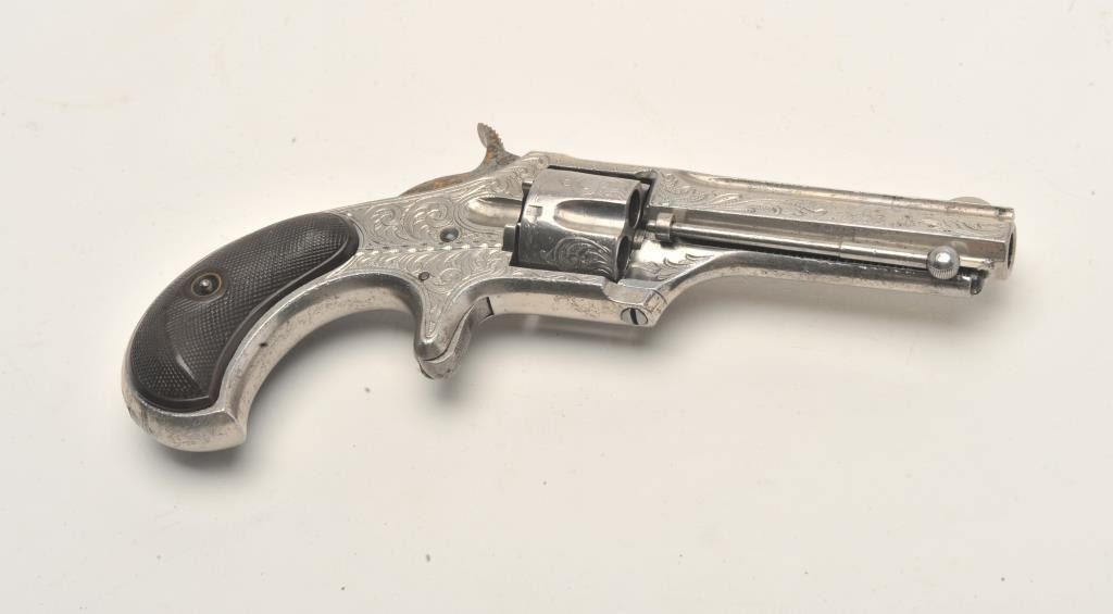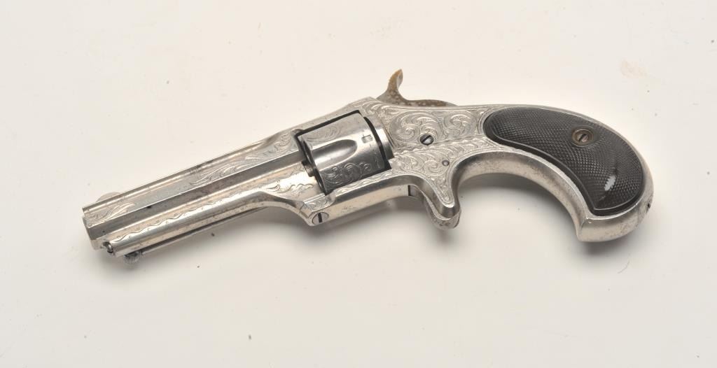 Engraved Remington Smoot No. 1 Model spur trigger revolver, .30 caliber, 2.75” barrel, nickel finish, checkered black hard rubber grips, no visible S/N, in overall very good condition showing considerable originalnickel finish, good action, sharp markings, very good grips, fair to good bore overall. (Antique). Est.: $400-$800.