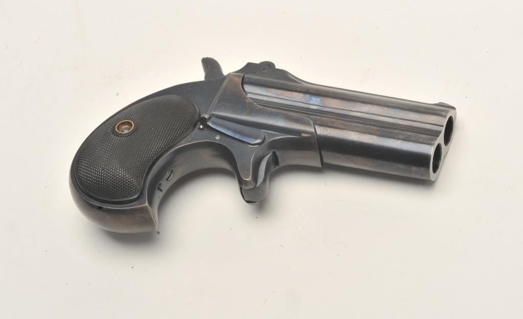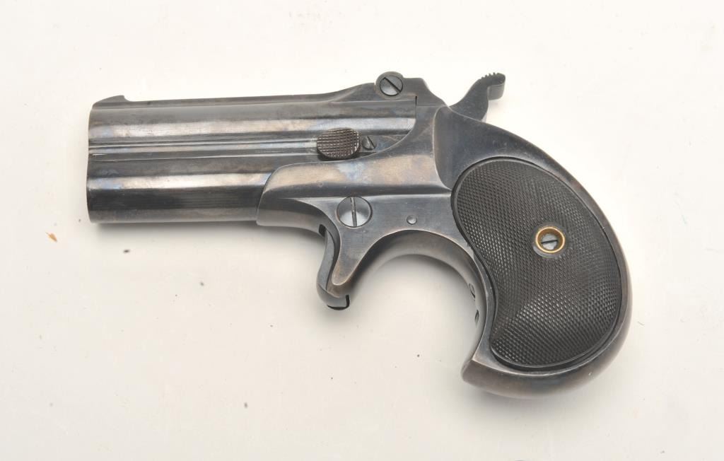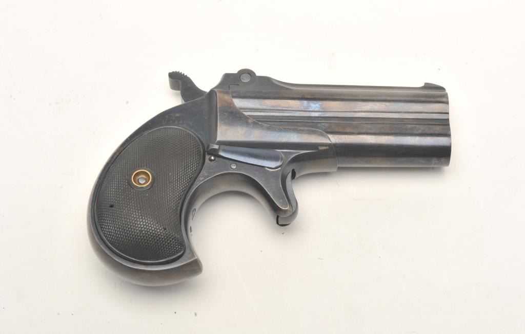 Remington Double O/U deringer, .41 caliber, 3” barrel group, blued finish, checkered black hard rubber grips, S/N 140, in overall fine to excellent condition showing the majority of its original finish, fine bores,crisp action, sharp markings and fine grips; shows little use and minimal handling. (C&R/PPT). Est.: $400-$800.