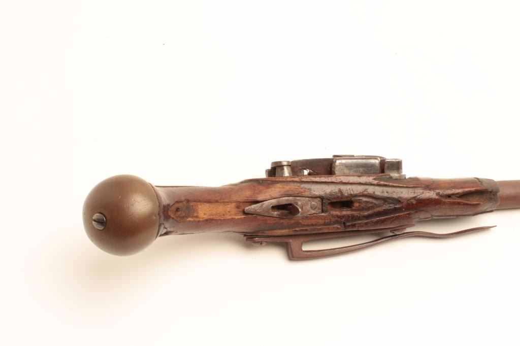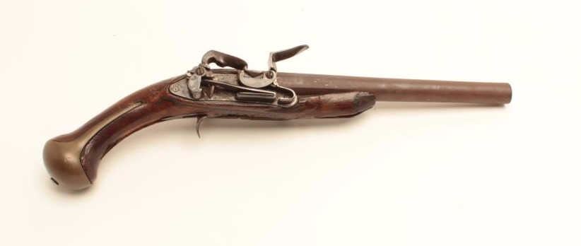 Spanish Pattern 1791 Cavalry pistol with Miquelet lock, approximately .70 caliber. The pistol is in good overall condition with a 10 ¾” with a half octagon barrel. The barrel is entirely brown patina with lightsurface rust. The lock does not appear to be marked and has gone to dark patina. The smooth wood stock shows significant wear with the barrel loose in its channel. The trigger guard assembly is missing, but thetrigger is intact, while the pistol butt is brass which has toned nicely. The type of pistol used in California during the expansion of the missions, the pistol was formerly displayed at the Mission San JuanCapistrano museum until the 1980’s. The consignor notes indicate the barrel is dated 1785. A nice piece with early California history from the Gil Newton Collection. Est.: $500-$1,000. (Antique).