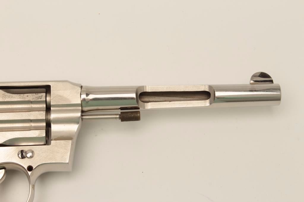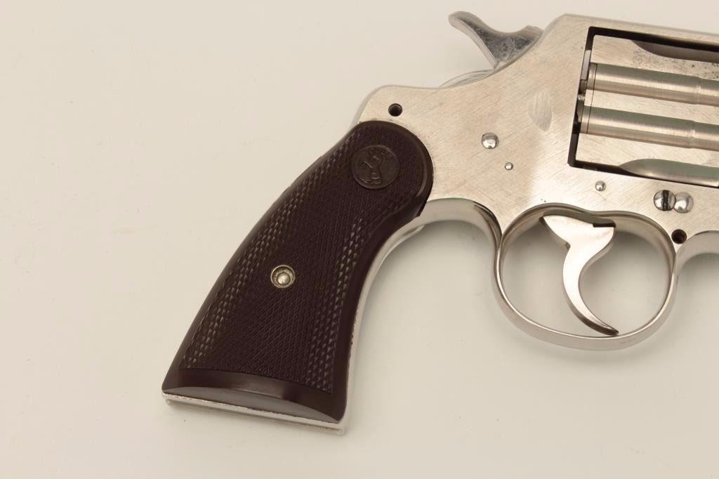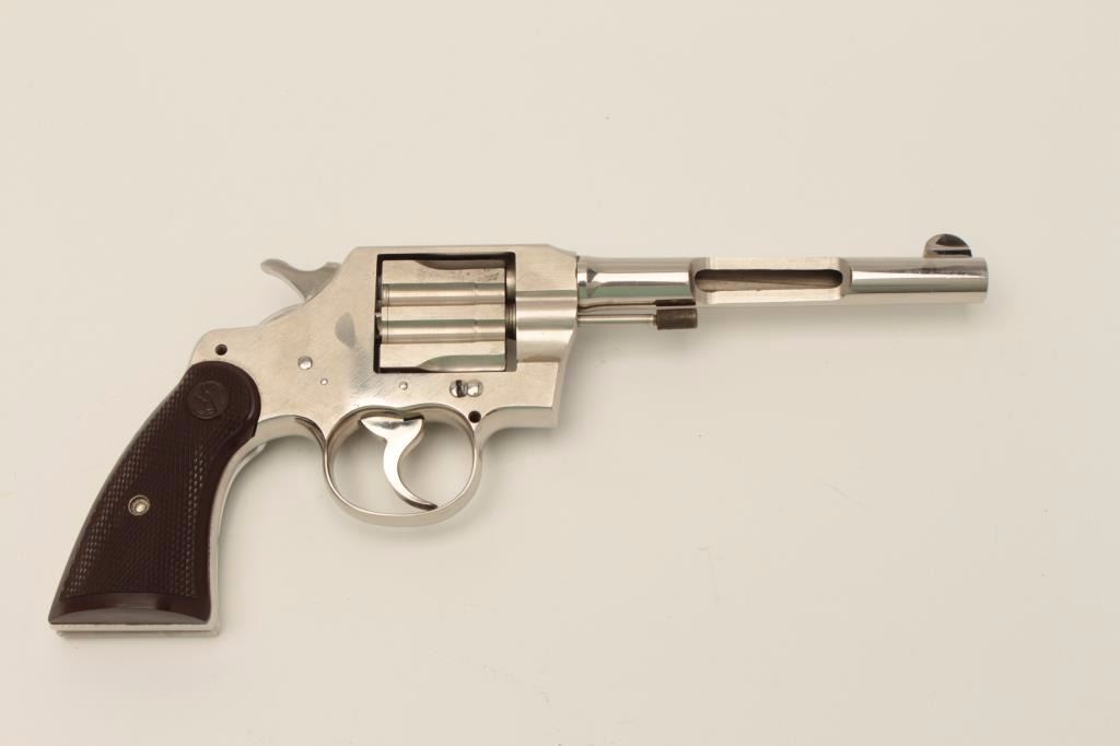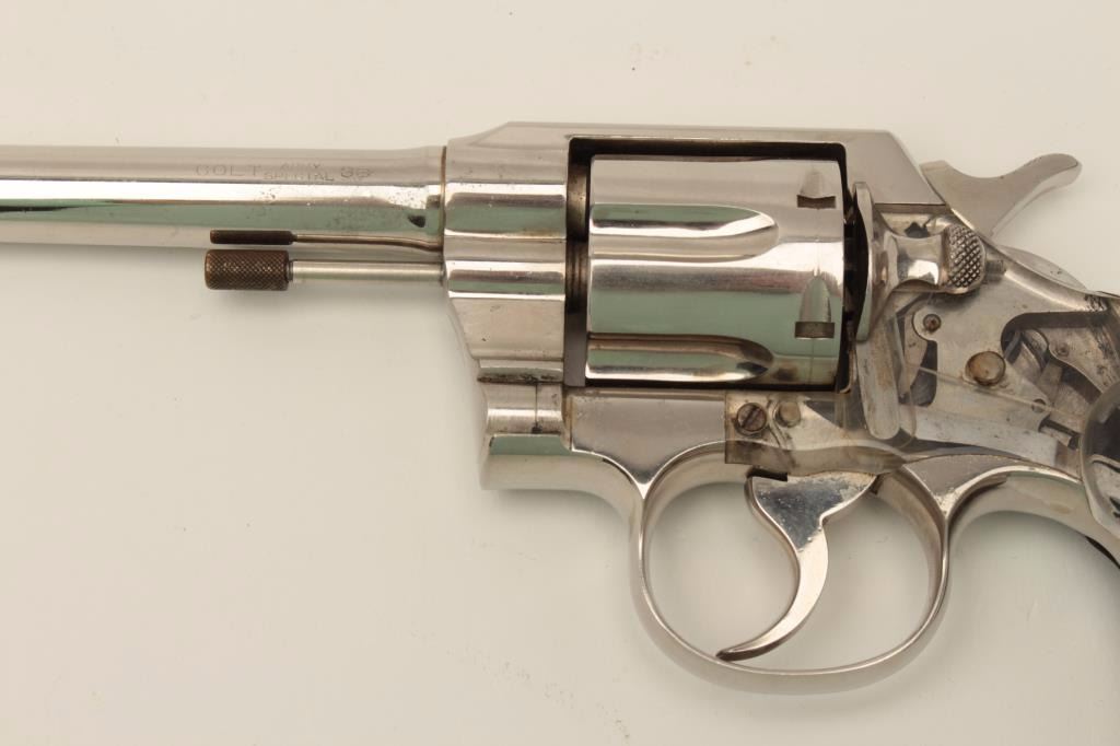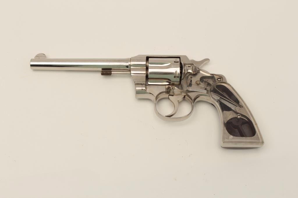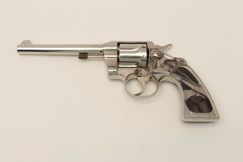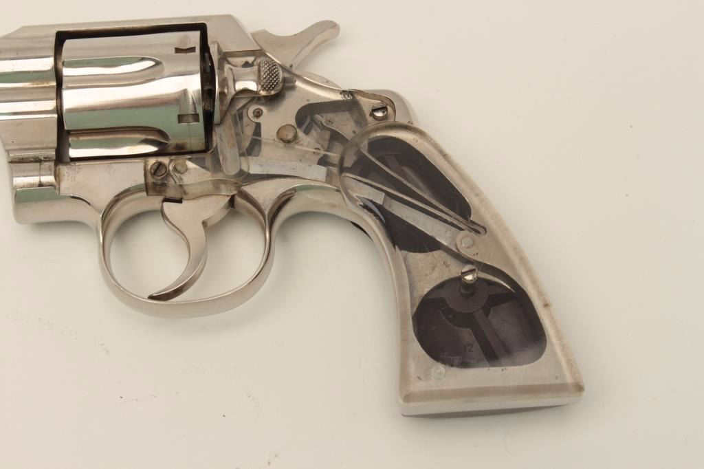 Colt Army Special revolver, .38 Special, Serial NSNV. A factory cut-away display model with the right side milled flat to be placed on a display board. The pistol has no serial number and no proof mark. The pistol features clear plastic on the cut-away and a Colt marked checkered plastic grip on the opposite side. The pistol was manufactured in 1927 and retains nearly all of its factory nickel finish with a 6” barrel. A trulyunique piece from the Gil Newton Collection. Est.: $1,500-$3,000.