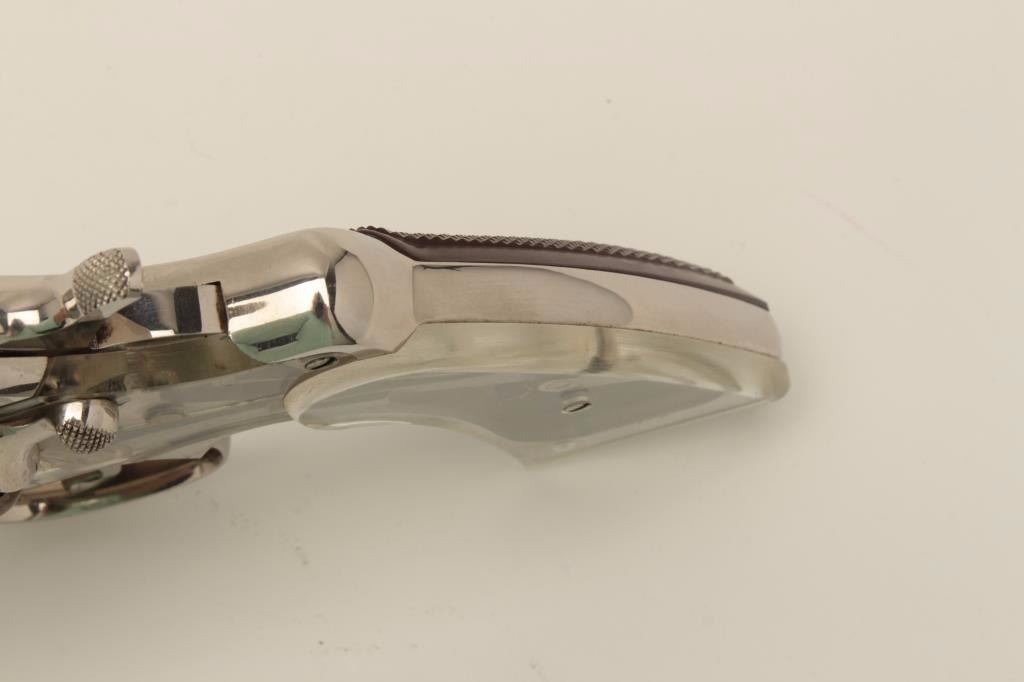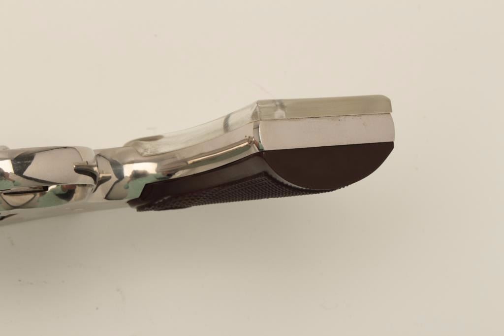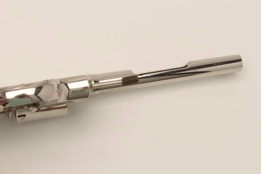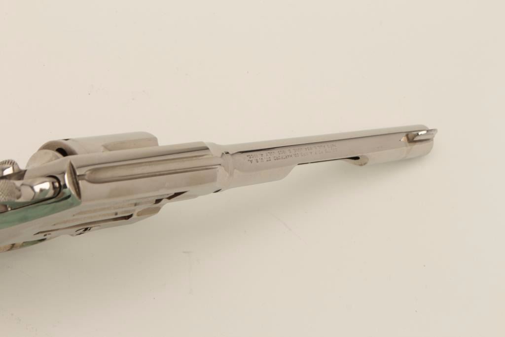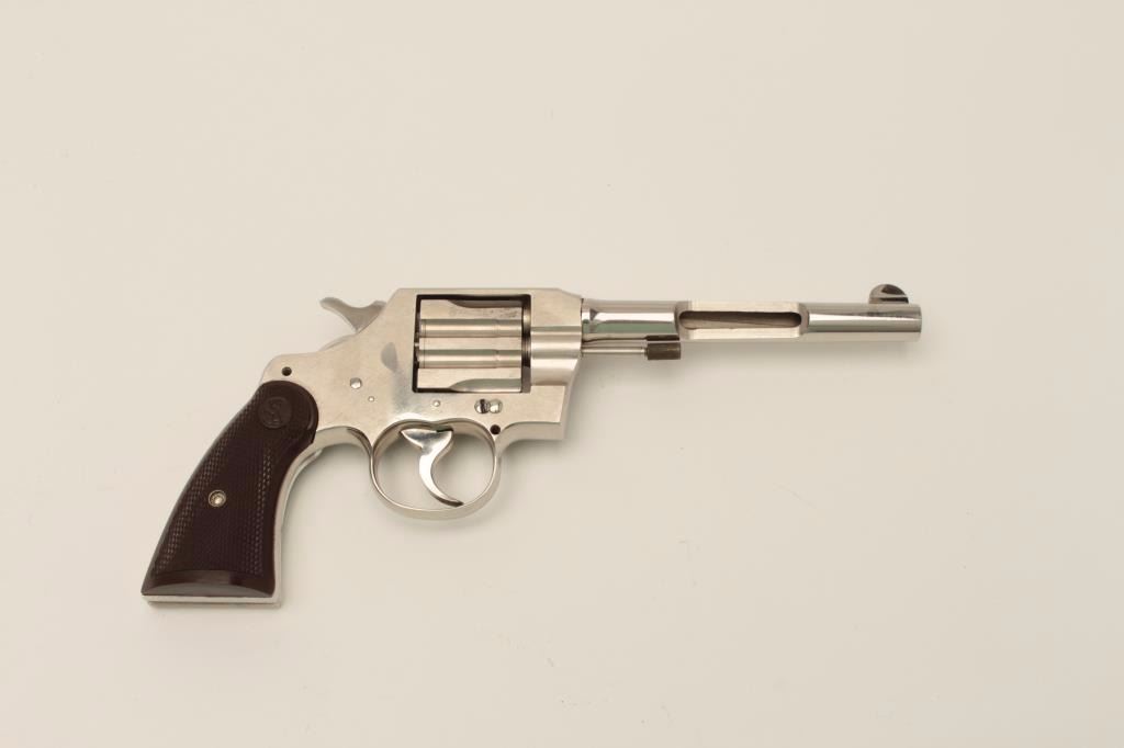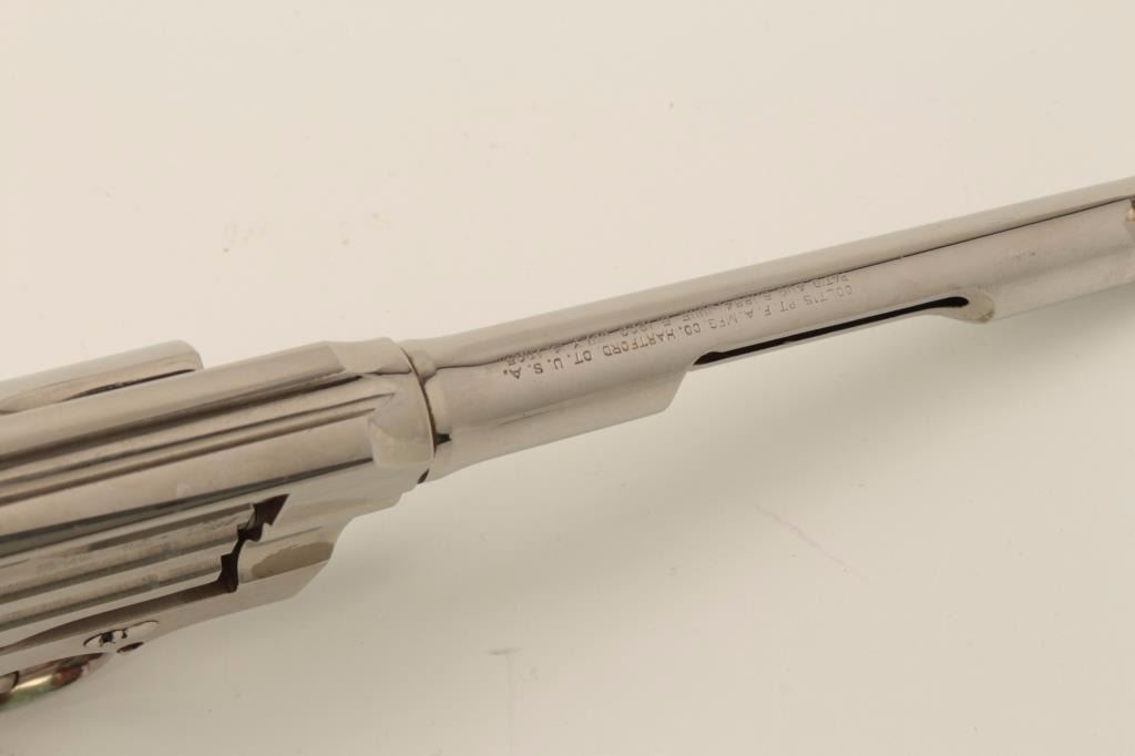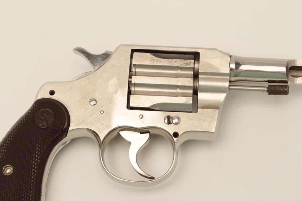 Colt Army Special revolver, .38 Special, Serial NSNV. A factory cut-away display model with the right side milled flat to be placed on a display board. The pistol has no serial number and no proof mark. The pistol features clear plastic on the cut-away and a Colt marked checkered plastic grip on the opposite side. The pistol was manufactured in 1927 and retains nearly all of its factory nickel finish with a 6” barrel. A trulyunique piece from the Gil Newton Collection. Est.: $1,500-$3,000.