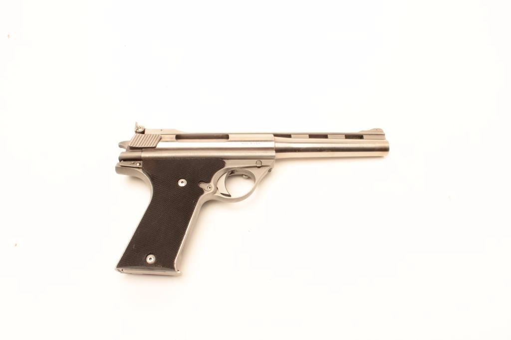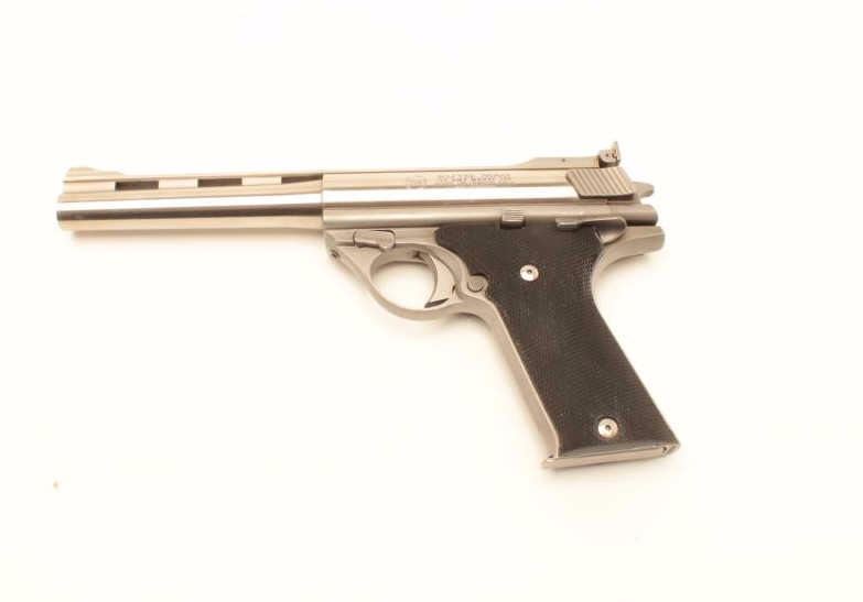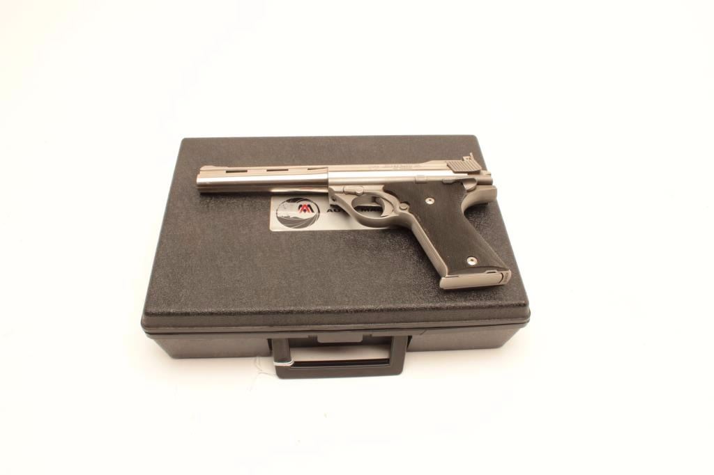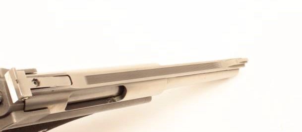 TDE Auto Mag (North Hollywood, CA) Model 180 semi-automatic pistol, modified for firing blanks, .44 AMP caliber, 7” ventilated rib barrel, stainless, checkered polymer grips, S/N A03903, in overall very good conditionwith a crisp action, sharp markings and very good grips. Accompanied by an Oct. 17, 2007 letter from Little John’s Auction Service indicating gun may have been from the Stembridge Gun Arsenal as at that time ofthat sale, another similar gun had a tag stating “Clint Eastwood Sudden Impact” and this one may have been a back up piece for the movie. Accompanied by a factory hardcase, shooter’s manual and a plastic case containing ammunition and some spent brass casings. (Modern/PPT). Est.: $600-$1,200.