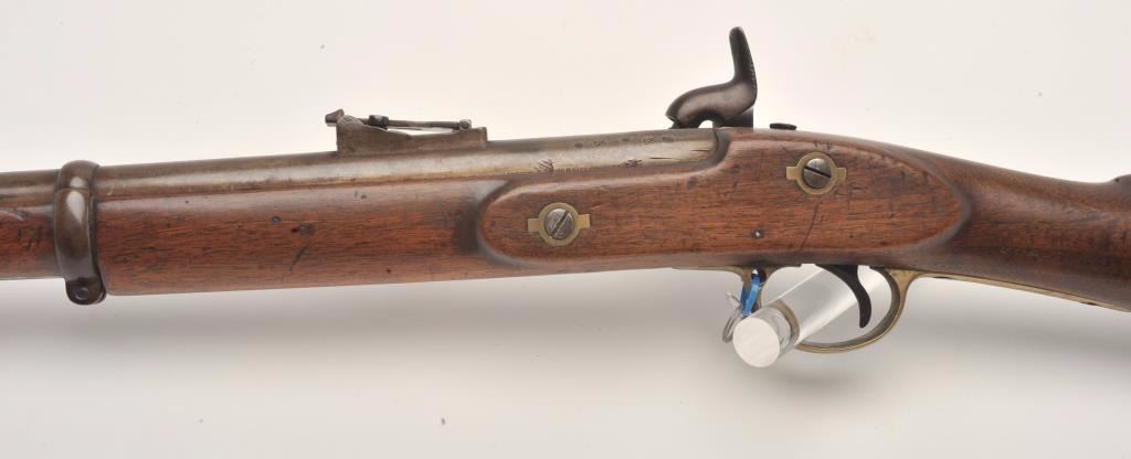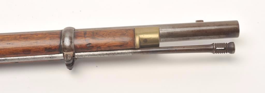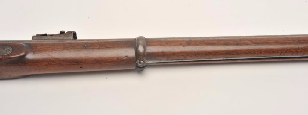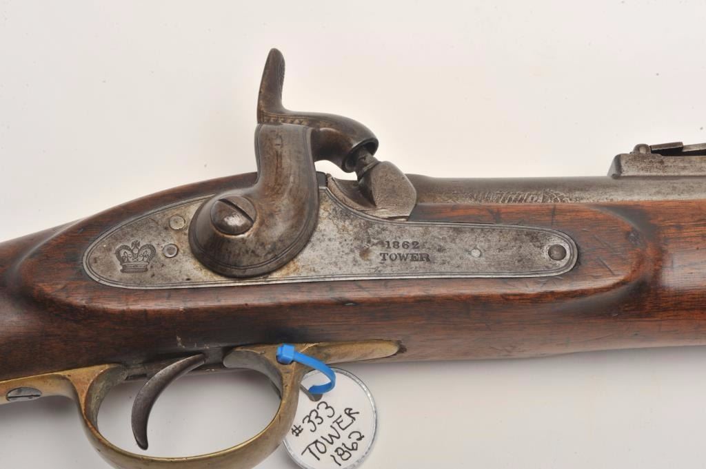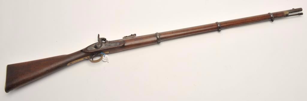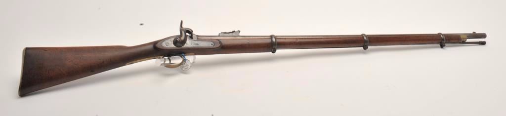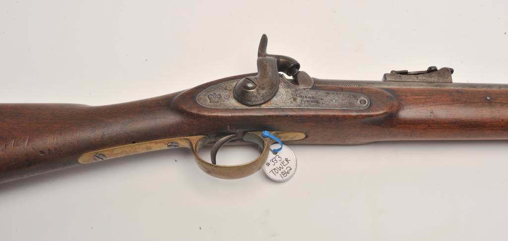 British Tower percussion rifle, .58 caliber, 38” barrel, brass trigger guard and butt plate, wood full length stock, lockplate dated 1862, in overall very good condition displaying a pleasing patina to metalsurfaces, crisp action, sharp markings and very good wood showing scattered old mars and dings from carry and storage. (Antique). Est.: $600-$1,200.