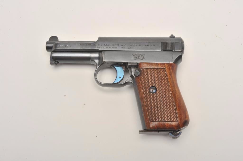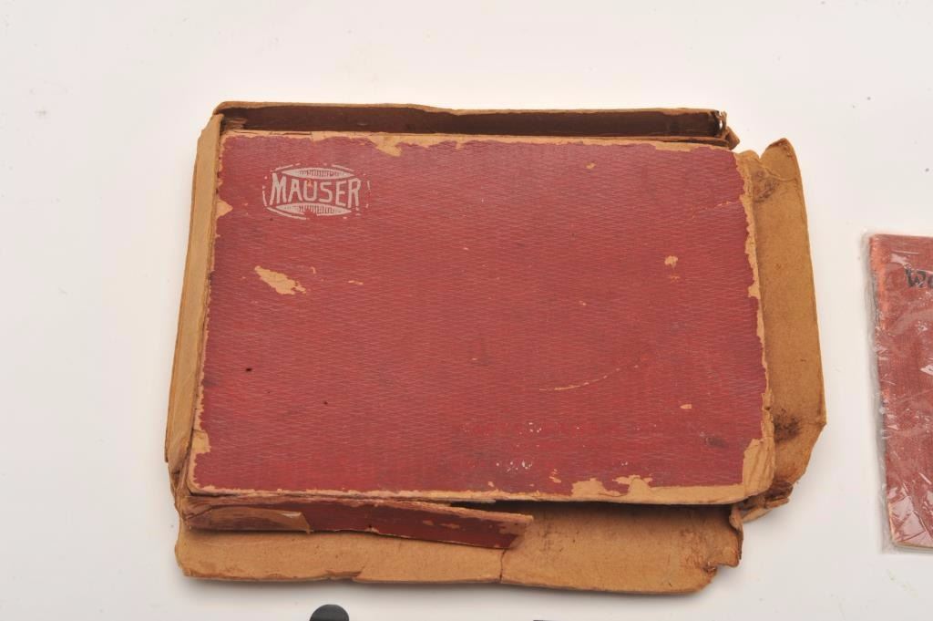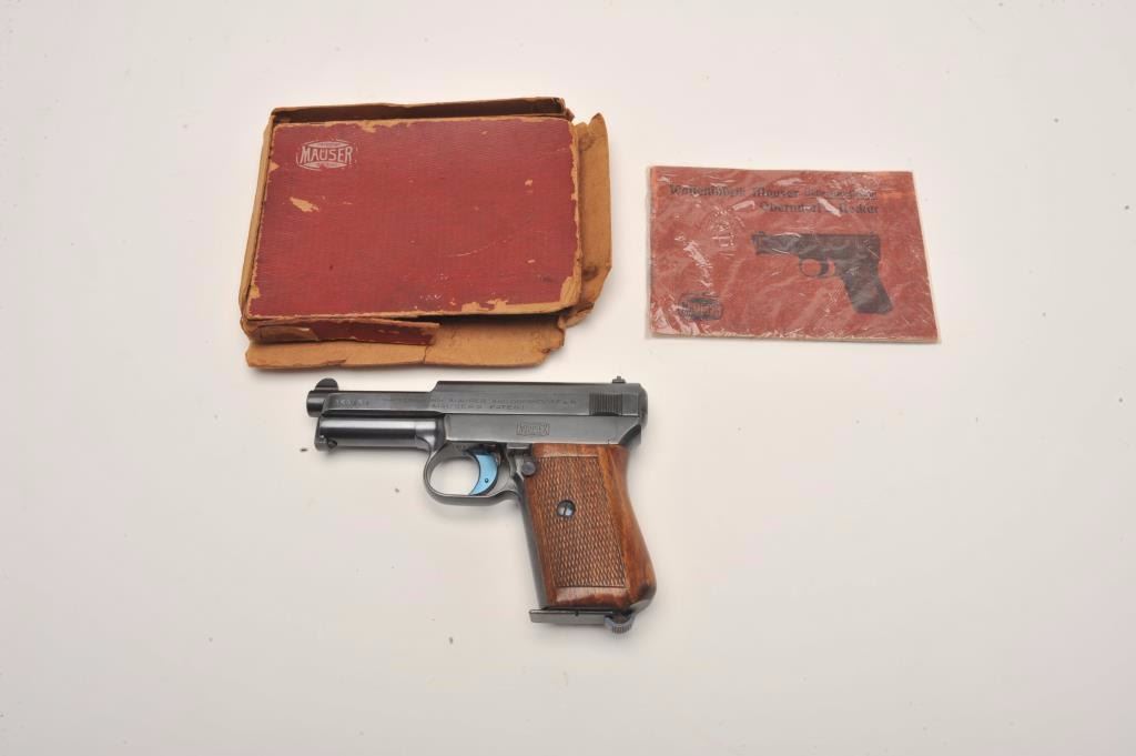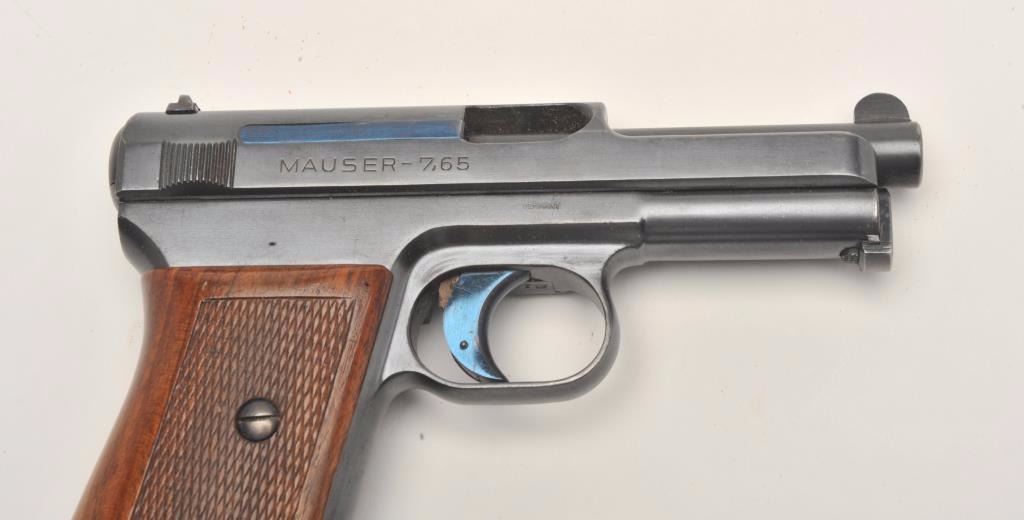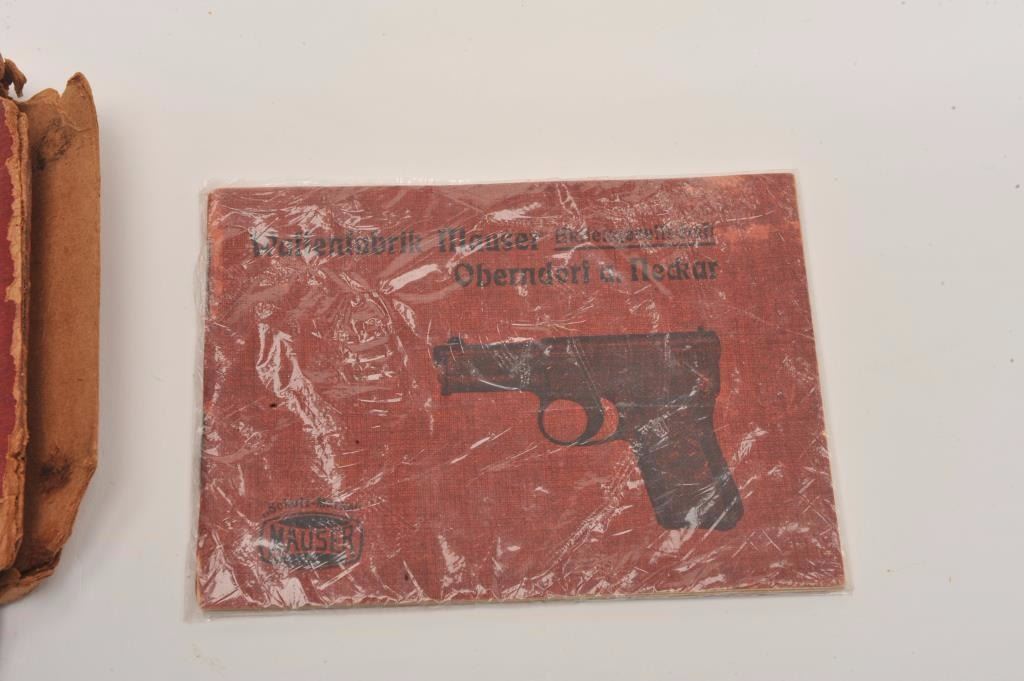 Mauser Pocket semi-automatic pistol, 7.65mm caliber, 3.5” barrel, blued finish, checkered wood grips, S/N 368191, in overall fine condition displaying the majority of its original blued finish with fiery niter blueon trigger, fine bore, crisp action, sharp markings and fine grips. Also accompanied by a red colored cardboard factory two piece box with instructions. The box shows scattered wear, damage and some missing parts of panels. (C&R/PPT). Est.: $600-$1,200.
