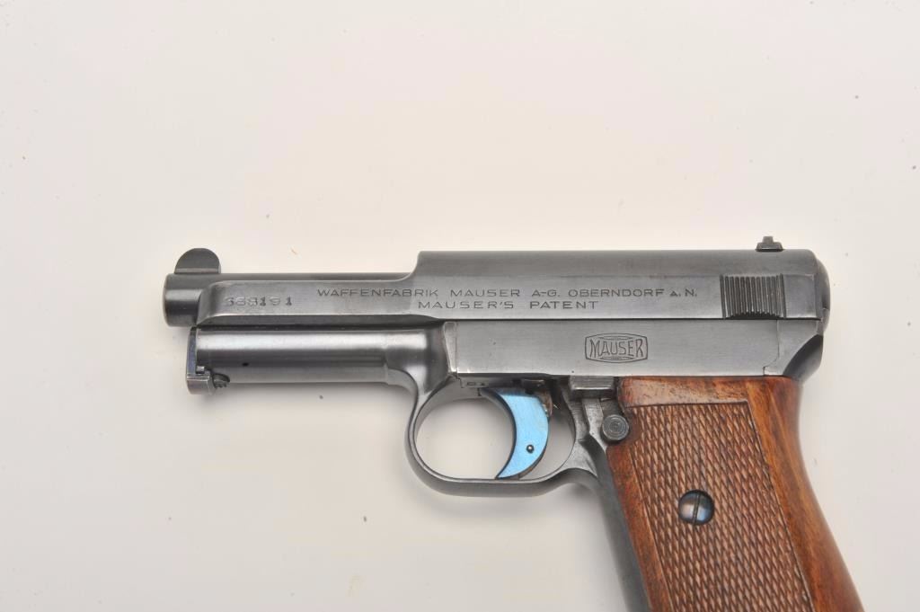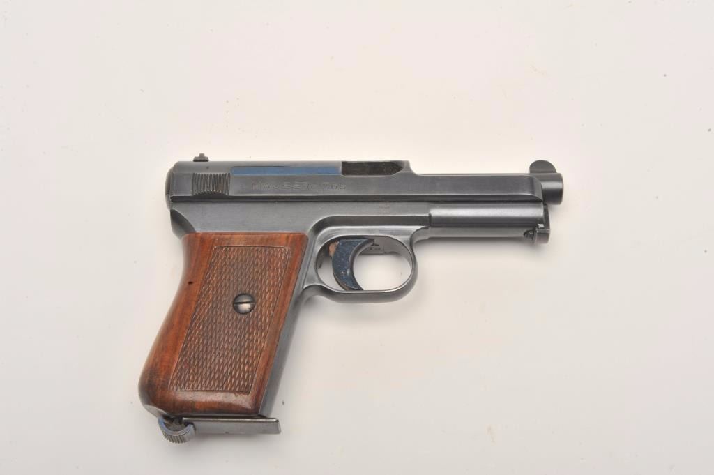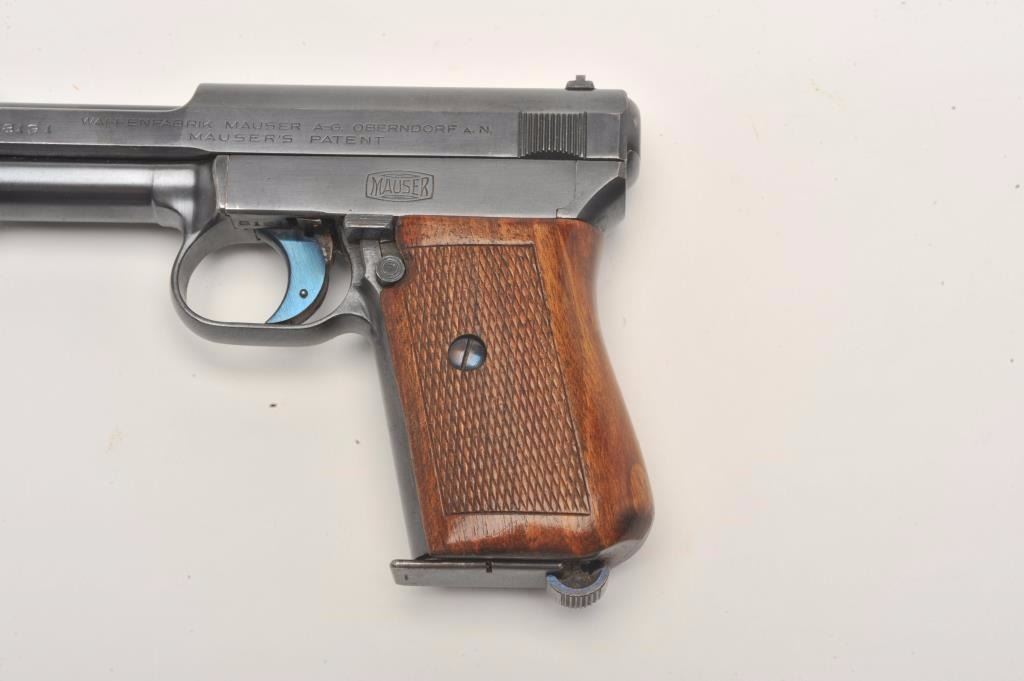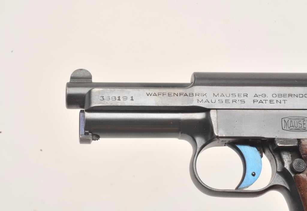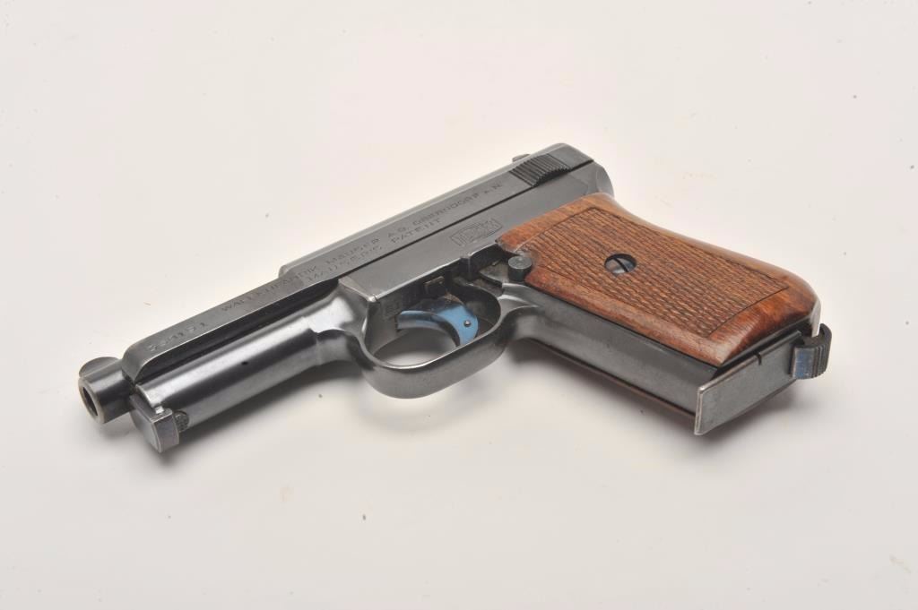Mauser Pocket semi-automatic pistol, 7.65mm caliber, 3.5” barrel, blued finish, checkered wood grips, S/N 368191, in overall fine condition displaying the majority of its original blued finish with fiery niter blueon trigger, fine bore, crisp action, sharp markings and fine grips. Also accompanied by a red colored cardboard factory two piece box with instructions. The box shows scattered wear, damage and some missing parts of panels. (C&R/PPT). Est.: $600-$1,200.