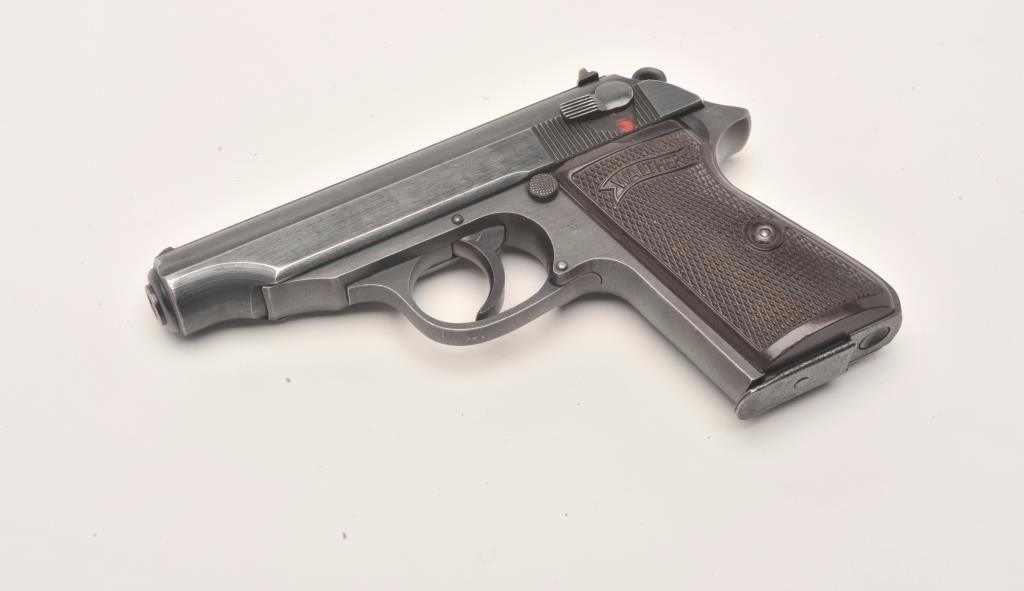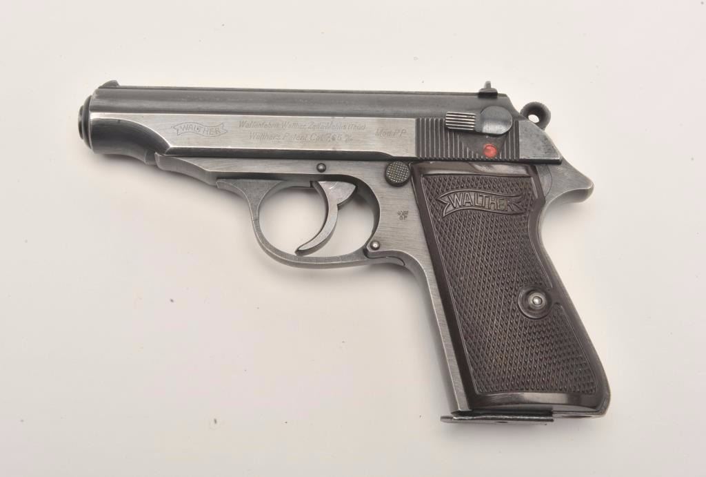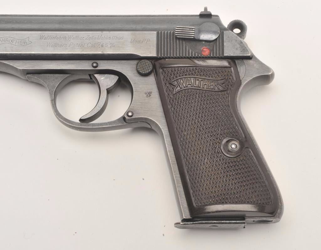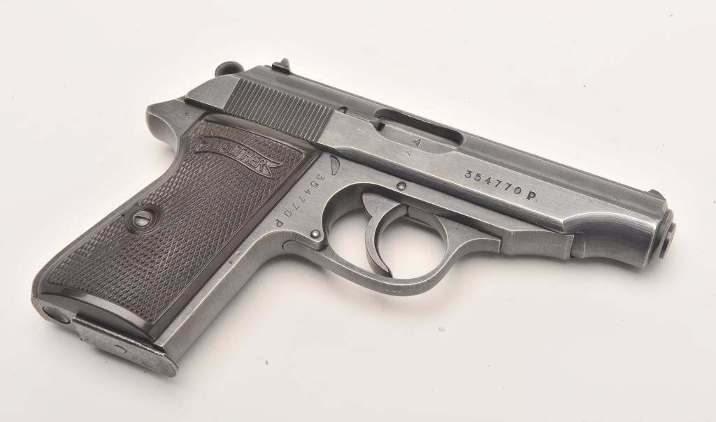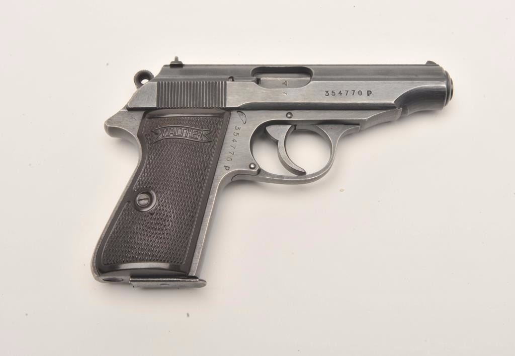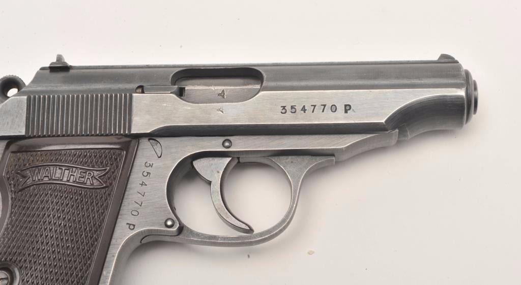 Walther Model PP semi-automatic pistol, Eagle “F” police proof, 7.65mm caliber, 3.75” barrel, blued finish, checkered plastic grips, S/N 354770P, in overall very good to fine condition displaying the majority of its blued finish, fine bore, crisp action, crisp markings and fine grips. (Modern/PPT). Est.: $600-$1,200.