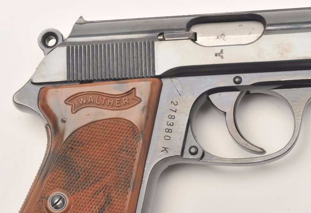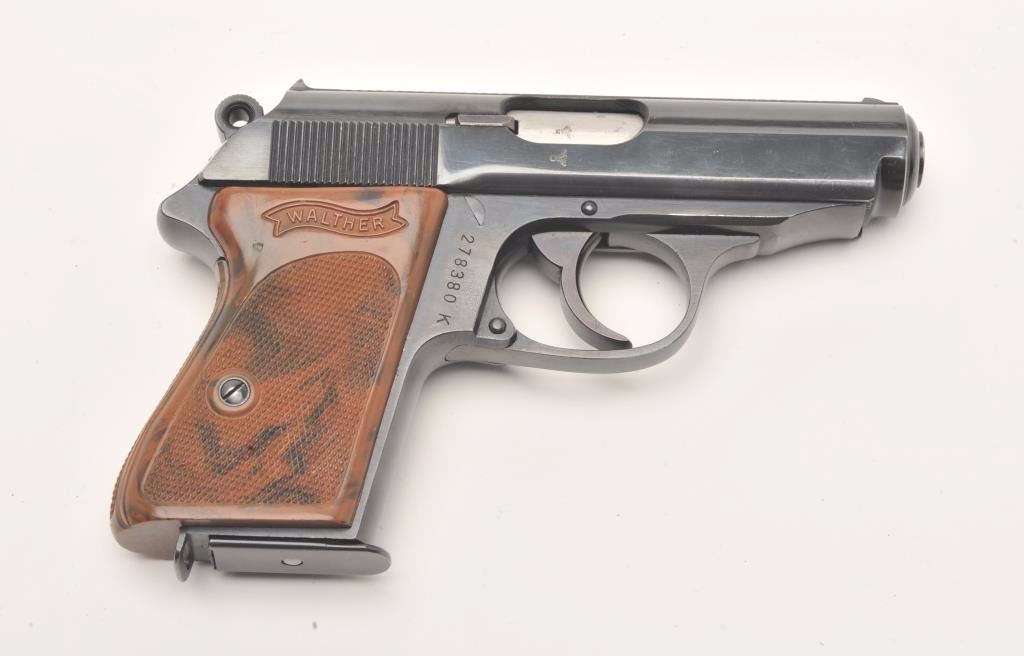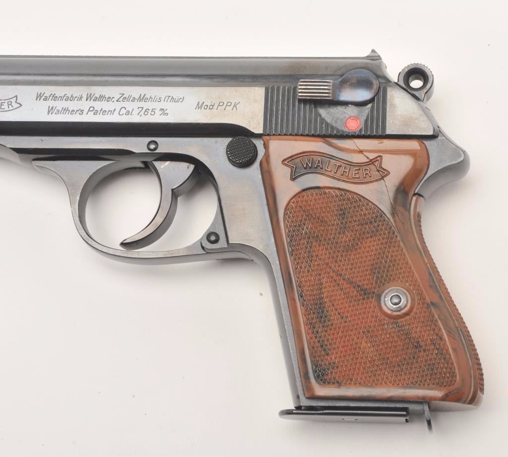 Walther Model PPK pre-war Commercial semi-automatic pistol, 7.65mm caliber, 3” barrel, blued finish, checkered brown plastic grips, S/N 278380K, in overall very good to fine condition showing the majority of itsoriginal finish to metal surfaces, near fine bore, crisp action, sharp markings and good grips with an old crack on the rear top side of the left grip. (C&R/PPT). Est.: $600-$1,200.