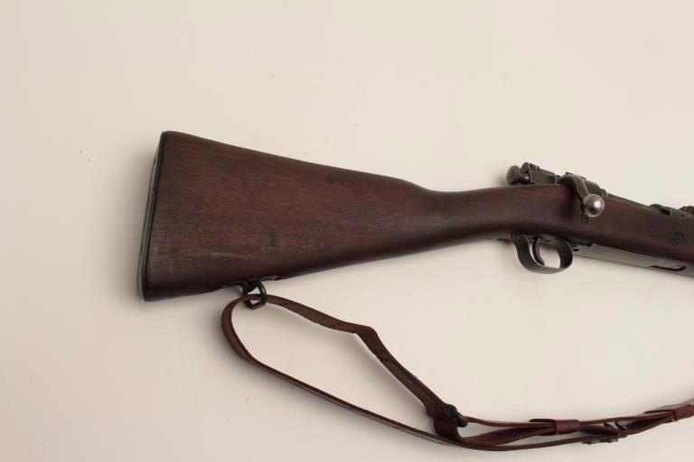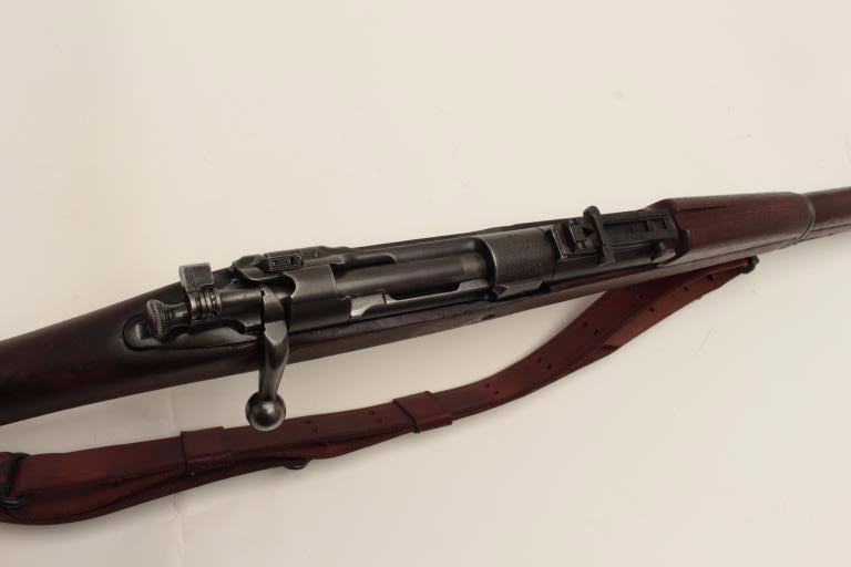 U.S. Springfield Model 1903 bolt action military rifle, .30-06 caliber, 24” H.S.-marked barrel dated 9-44, re-worked for WW II service, military finish, wood stock, leather sling, S/N 491699, in overall verygood condition showing the majority of its military finish, very good bore, crisp action and markings, very good stock with P stamp behind trigger guard (and on floor plate). (C&R/No PPT). Est.: $350-$700.