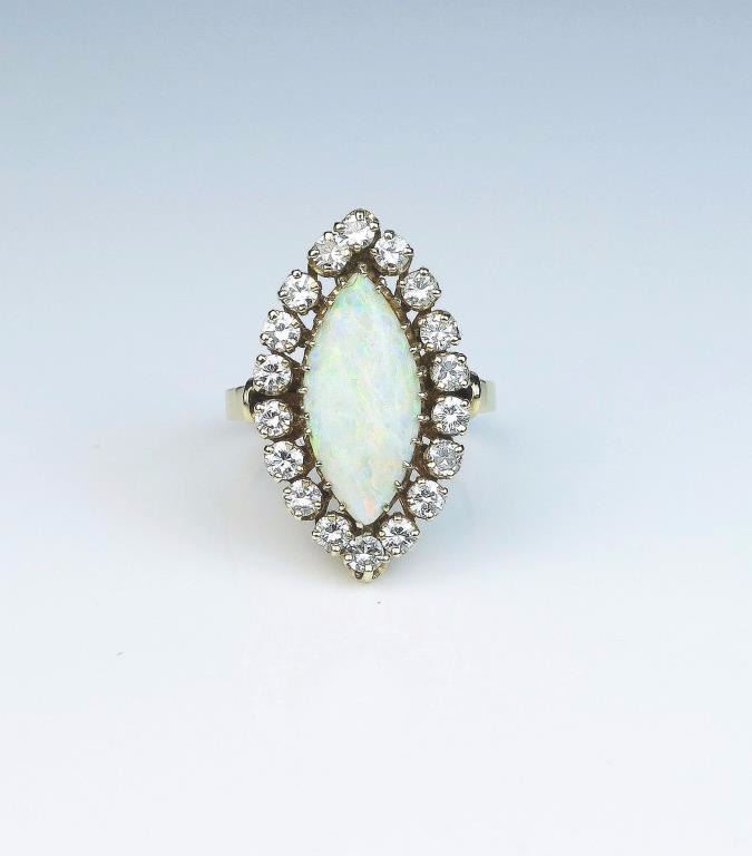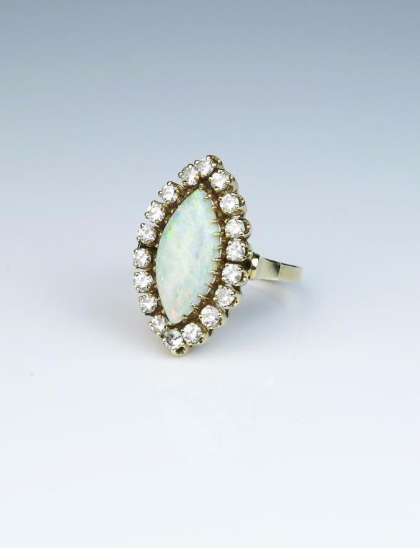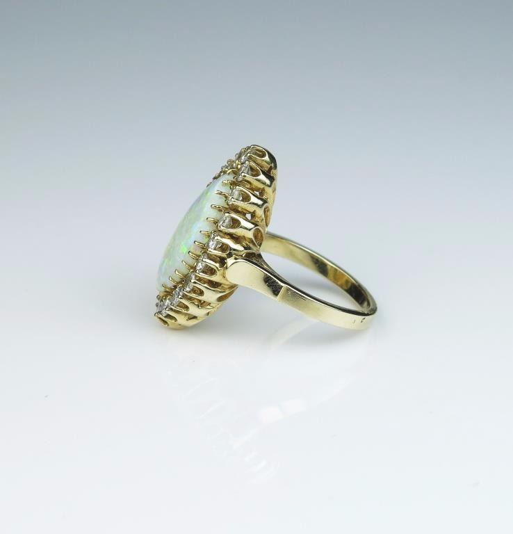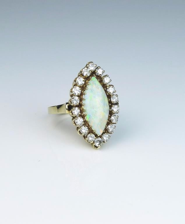 Exquisite Vintage ring featuring a MQ shaped Australian Opal weighing approx. 4.00 carats and surrounded by 18 full cut diamonds weighing approx. 1.50- 2.00 carats of G-H colors and SI clarity set in a 14 karatyellow gold vintage setting. Retail $5,000-$7,000 Estimates $3,000-$4,000