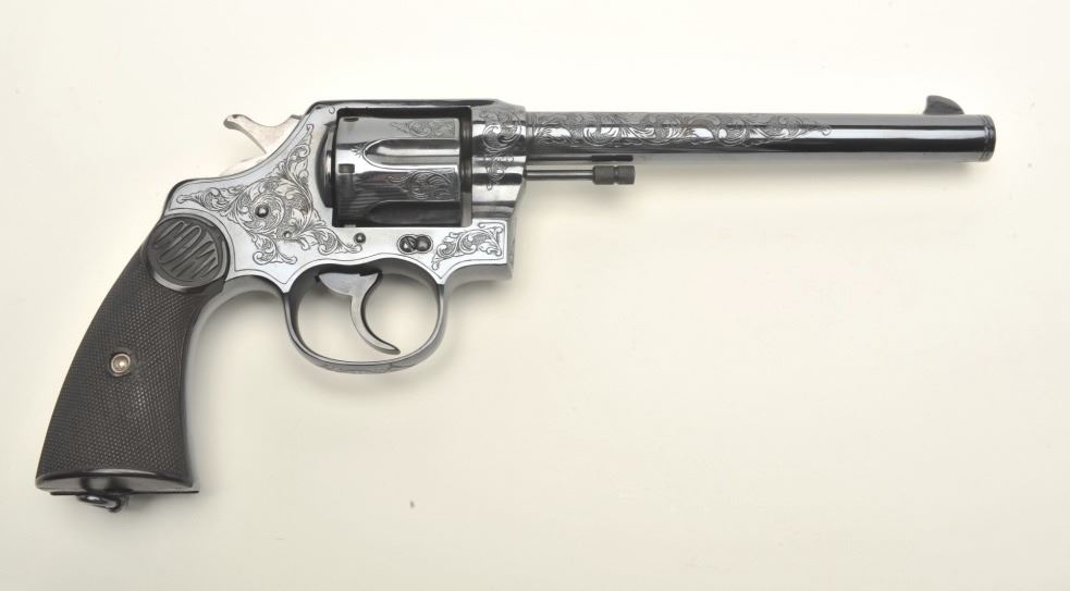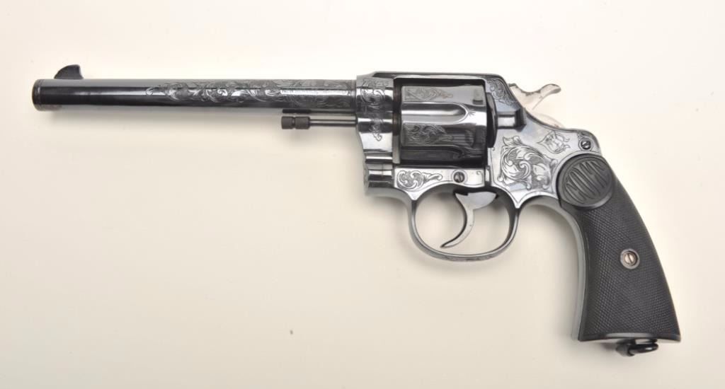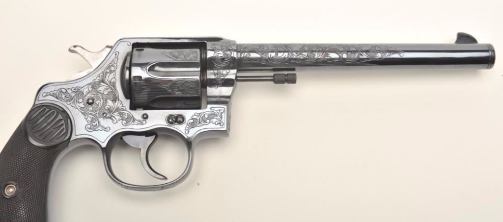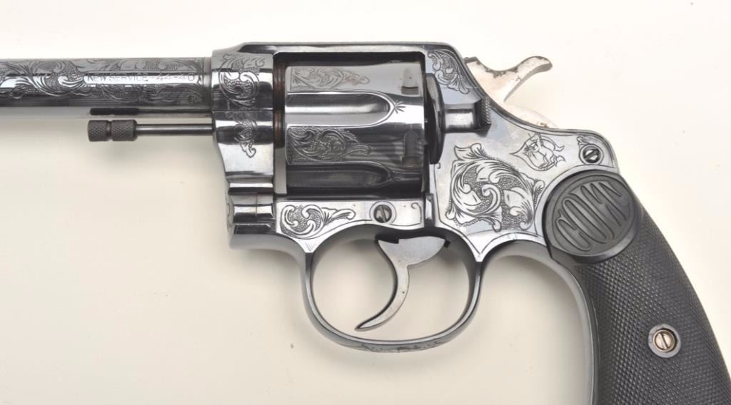 Colt New Service DA revolver, engraved (non-factory), .44-40 caliber, 7.5” barrel, re-blued finish, checkered black hard rubber grips, S/N 29524, in overall very good condition as custom engraved and re-finished; crisp action, sharp markings, very good grips; bore shows some scattered light pitting; nicely executed engraving. (C&R/PPT). Est.: $1,250-$2,500.