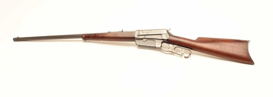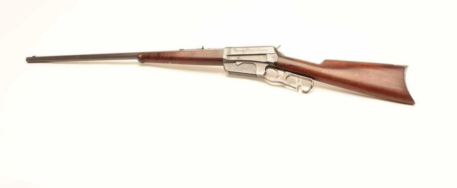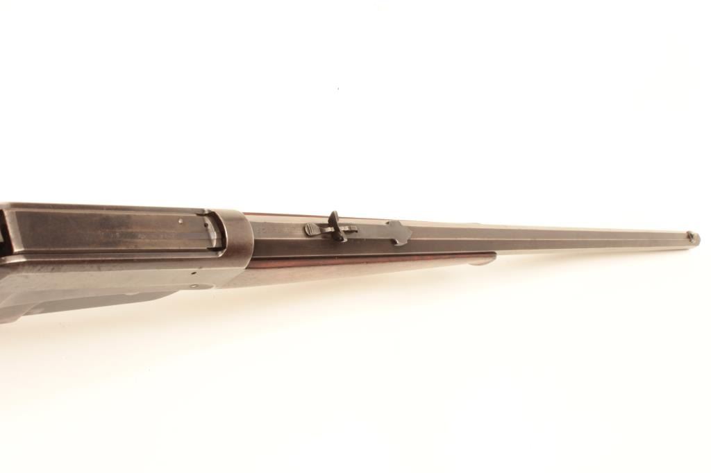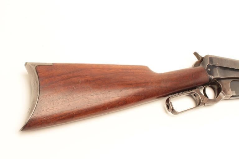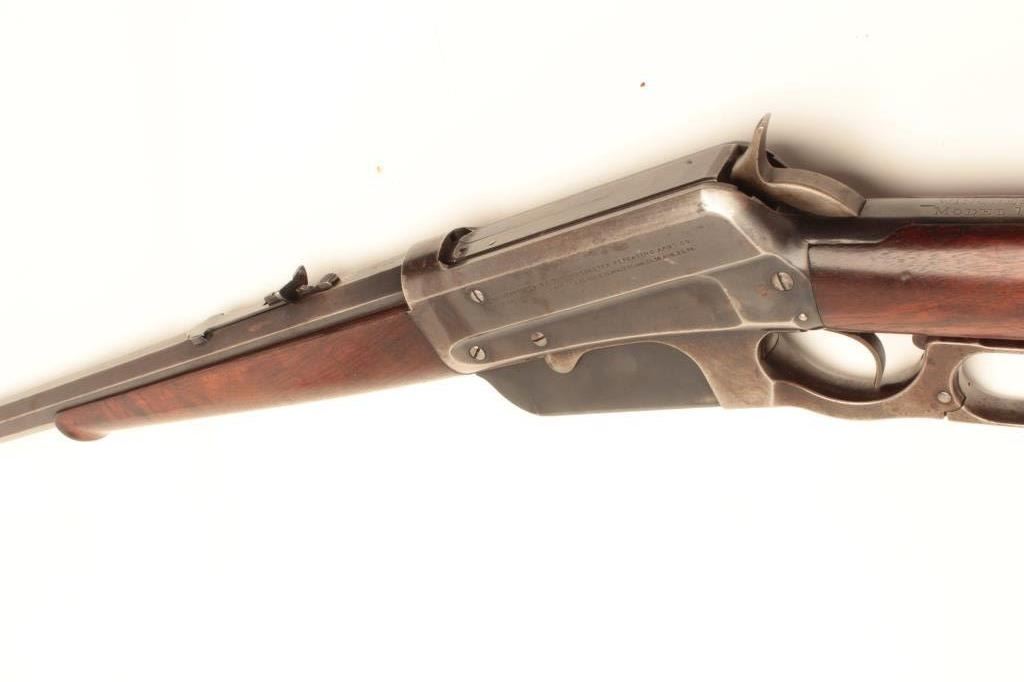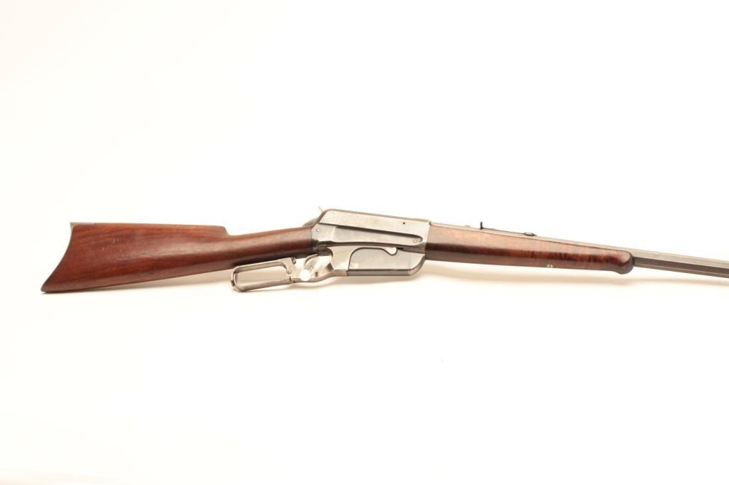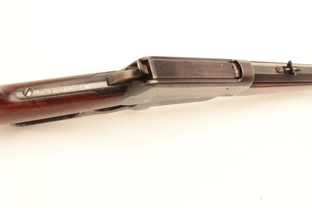 Winchester Model 1895 lever action rifle, 38-72 W.C.F. cal., serial #40607. The rifle is in very good overall condition with a rare 26” octagonal barrel. The barrel retains a significant amount of its muted blued finishwith sharp edges and wears at the high points. The receiver retains a considerable amount of its flaking blue finish with light surface rust evident. The hammer and trigger assembly show dull case colors in theprotected areas. The smooth wood stocks are in very good condition with considerable figure noted in the fore end. The stocks show light storage marks and a smooth, crescent metal butt plate. The bore is verygood, the action crisp and markings are sharp on this desirable octagon barreled 1895 Winchester. Est.: $2,500-$5,000. (C+R).