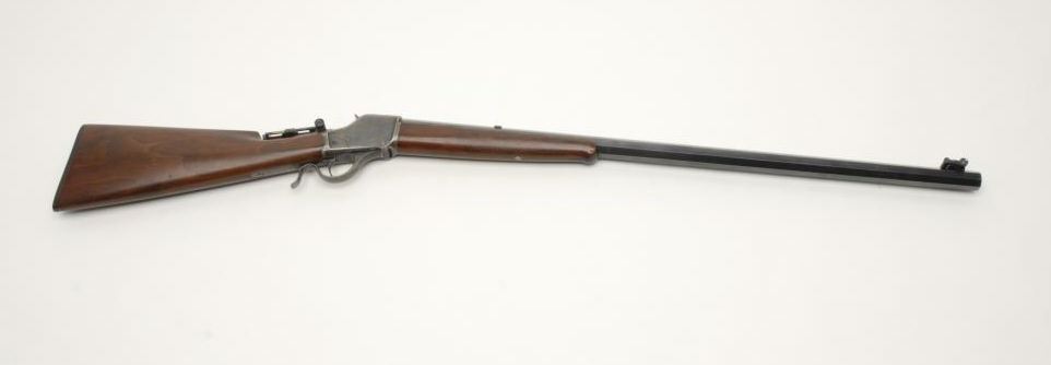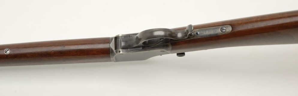 Winchester Model 1885 Hi-Wall single shot rifle, 38-55 cal., serial #64257. The rifle is in very good to nearly fine condition with an octagon barrel. The barrel retains nearly all of an old quality re-blue finishwith a later replacement globe front sight and later mid-range tang sight. The rear sight dovetail has been filled. The receiver shows beautiful, toning case color on both sides, the breech block and lever. The rifle has a single trigger. The smooth wood stocks are in very good overall condition with small mars and compressions consistent with handling. The butt stock ends with a hard rubber Winchester marked butt plate. The bore is very good, the action crisp and markings are sharp. Est.: 2000-4000. (C+R).